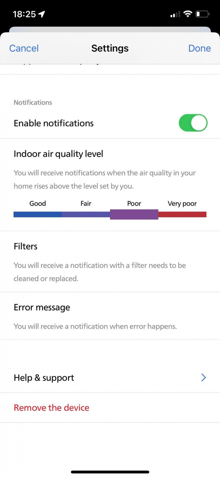 ในการตั้งค่าการทำงานของ เครื่องฟอกอากาศ Philips 1000i Series เราสามารถกำหนดให้มันส่งการแจ้งเตือนมาทางแอปพลิเคชันเมื่อคุณภาพอากาศกำลังแย่ถึงระดับหนึ่งได้ด้วย ซึ่งปกติแล้วจะมี 4 ระดับที่เซ็นเซอร์เครื่องฟอกได้แบ่งเอาไว้ คือ ดี (Good), ปานกลาง (Fair), แย่ (Poor) และ แย่มาก (Very Poor) หากเราตั้งไว้ที่ระดับ แย่ (Poor) พอเซ็นเซอร์ตรวจเจอฝุ่นในห้องเพิ่มขึ้นในระดับที่กำหนด มันก็จะส่งข้อความมาแจ้งเตือน พร้อมกับการเร่งความแรงให้เครื่องทำงาน เป็นฟีเจอร์ที่ดีเหมือนกัน
