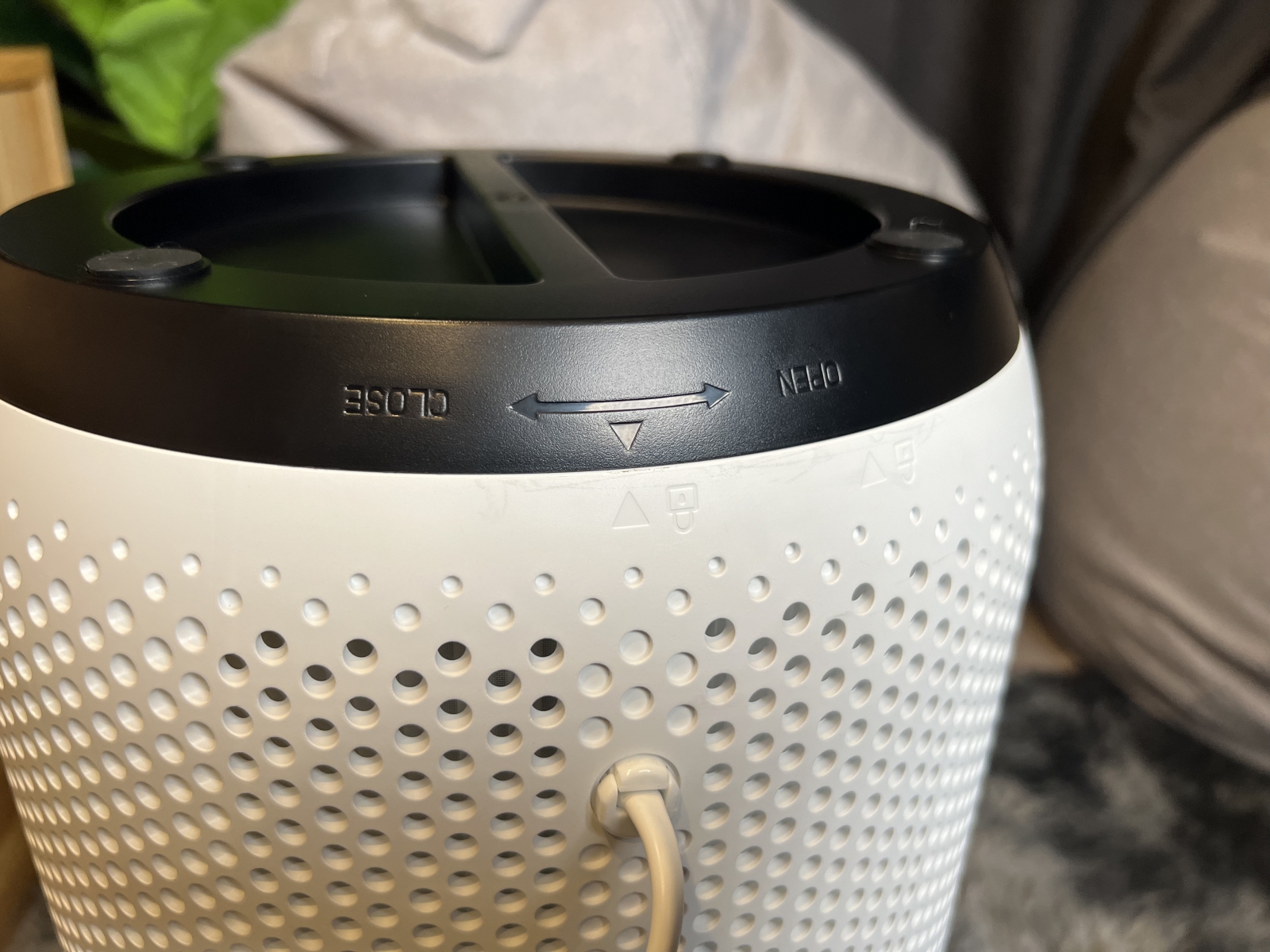 สำหรับวิธีเปิดไส้กรองออกมาเช็คสภาพ จริง ๆ ตำแหน่งของมันจะอยู่บริเวณช่องดูดอากาศที่เป็นแพทเทิร์นลายจุด ๆ และถ้าสังเกตที่ฐานใต้เครื่องจะมีฝาปิดอยู่ เวลาจะเปิดฝาให้เราพลิกเครื่องวางตั้งกลับด้านจะเห็นสัญลักษณ์เล็ก ๆ บอกว่าเราต้องหมุนไปทางไหนเพื่อเปิดฝา เราแค่หมุนแกนกลางของฝาตามทิศที่บอกไว้ก็จะแกะฟิลเตอร์ออกมาได้แล้ว ส่วนเวลาจะปิดก็อย่าลืมหมุนกลับในทิศตรงข้ามเพื่อล็อกฝาฐานไม่ให้ฟิลเตอร์มันหลุดเวลา ยกย้ายไปไหนด้วย
