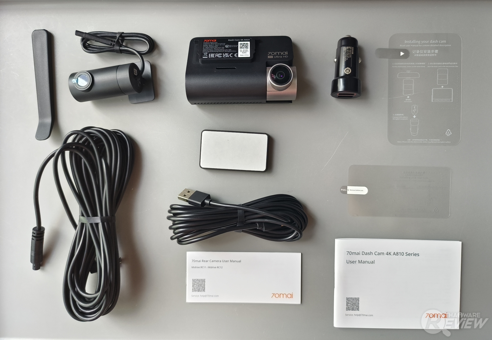 สำหรับอุปกรณ์ที่ให้มาในกล่องของ 70mai 4K A810 HDR เป็นชุดเซ็ตพร้อมใช้สำหรับการใช้งานกล้องพื้นฐาน สามารถติดตั้งทั้งกล้องหน้าและกล้องหลังพร้อมใช้งานได้ทันที แต่ไม่รวมการใช้งานแบบ Parking mode ที่ต้องใช้ Hardwire Kit เข้ามาเสริมนะ