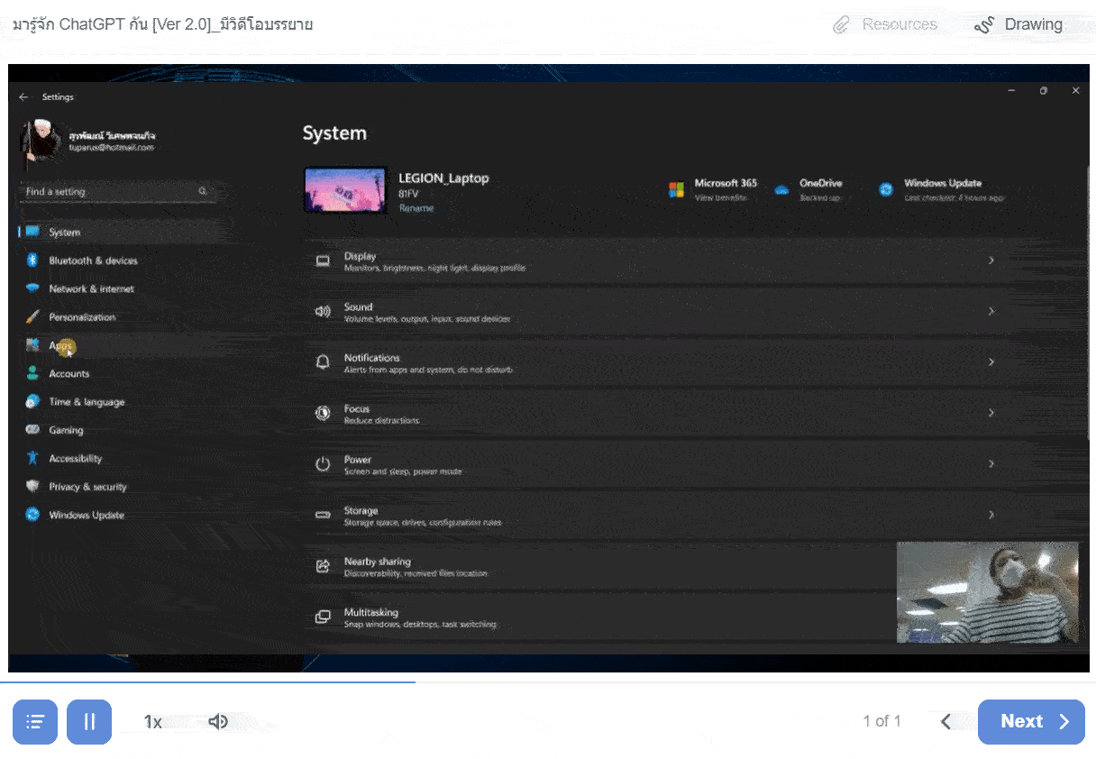 ฟีเจอร์ที่ยกระดับการเรียนออนไลน์ ให้ทำอะไรได้มากกว่าการแค่ฉายสไลด์งานนำเสนอคือ คือการใส่คำบรรยาย (Narration) ทั้งในรูปแบบเสียงพูดบรรยายเนื้อหาบทเรียน และการบรรยายในรูปแบบภาพวิดีโอพร้อมเสียงพูดของเรา ซึ่งเป็นการบันทึกวิดีโอได้ง่ายผ่านเว็บแคม