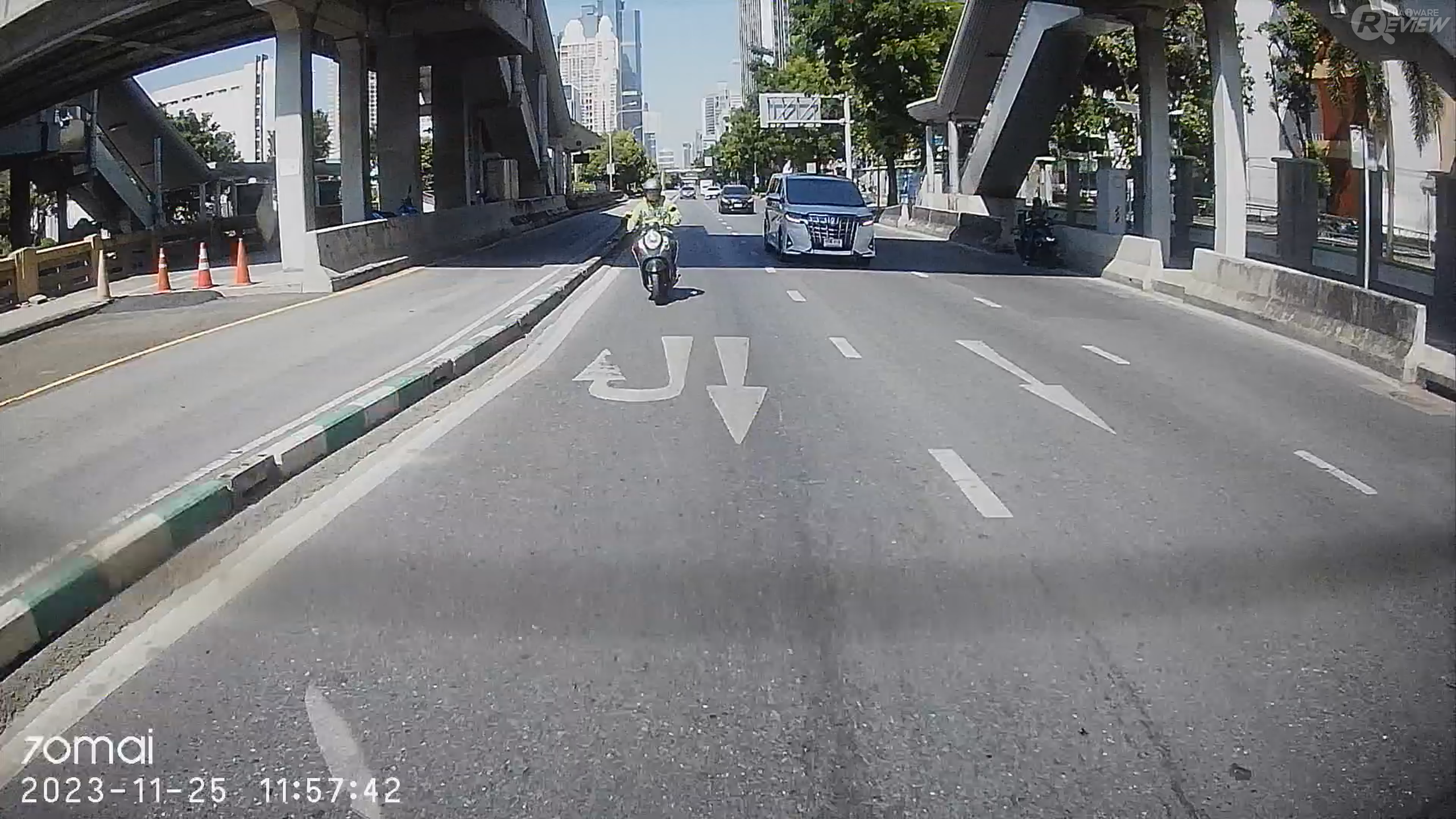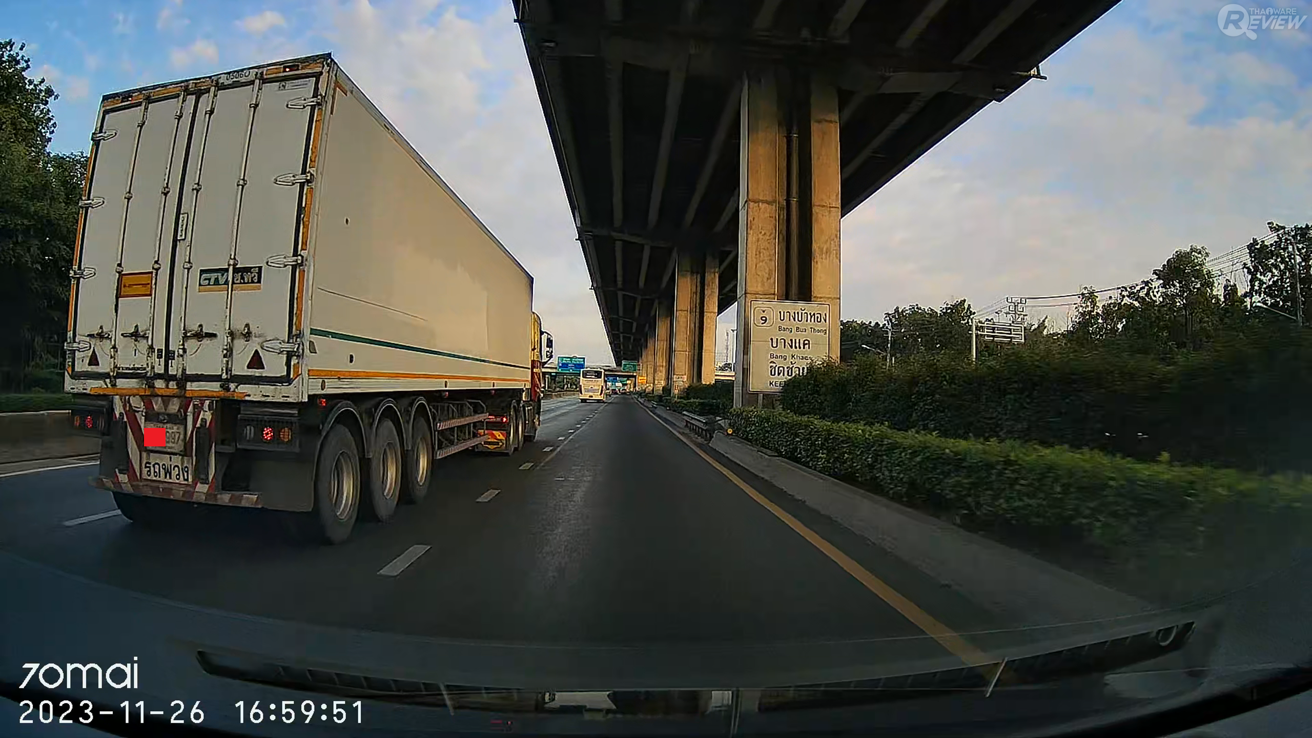 ภาพจากกล้องหน้าของ 70mai Dash Cam A200 สังเกตเห็นป้ายทะเบียนและป้ายจราจรที่คมชัด ความกว้าง 130 องศา ที่ครอบคลุมเลนทั้งซ้ายและขวา