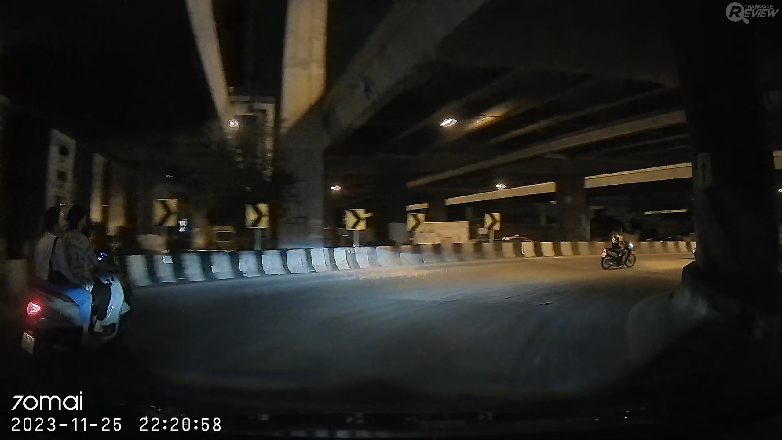 ภาพจากถนนแสงสว่างน้อยที่ถูกเพิ่มคุณภาพด้วย 70mai Night Owl Vision ทำให้พอมองเห็นรายละเอียดบ้าง