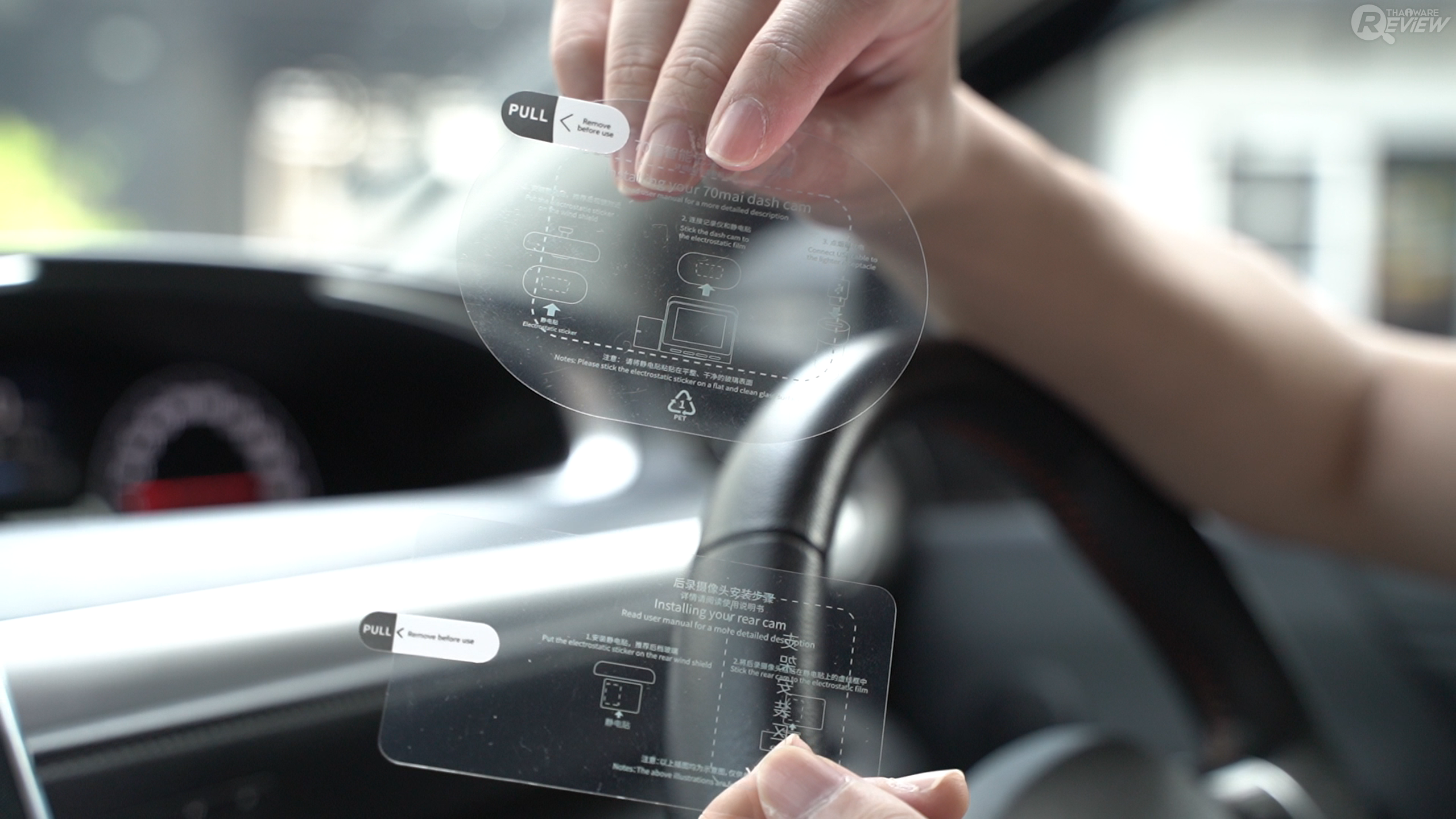 ตัวกล้องจะมีฐานติดกับกระจกแยก ไว้ถอดกล้องออกมาใช้งานอย่างอื่นได้ง่าย และมีสติ๊กเกอร์กันฟิล์มลอกมาให้รองก่อนติดกาว 3M ด้วย