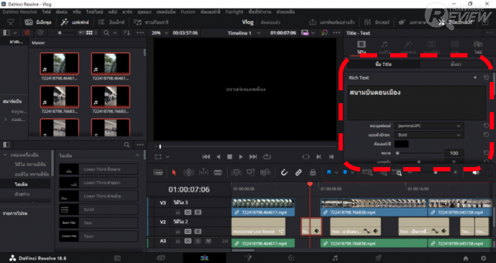 ก็จะมีการแสดงแถบเครื่องมือด้านล่างซ้าย ให้เราเลือกที่คำสั่ง ไตเติล (ตามภาพด้วยบน) ก็จะขึ้น รูปแบบ Text ให้เราเลือกใช้ตามต้องการ