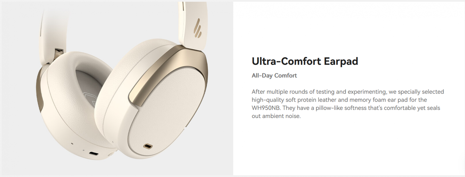 รางวัลการออกแบบที่ได้มานั้น เป็นเรื่องวัสดุครอบหูฟังที่ตอบโจทย์คนใช้งานหูฟังแบบครอบหูเป็นที่สุด โดย EDIFIER WH950NB มีคำนิยามความนุ่มของวัสดุครอบหูฟังว่า "Pillow-like" หรือเหมือนเอาหูแนบกับหมอนนั่นเอง เดี๋ยวเรามาดูในรีวิวจะเป็นอย่างที่ว่ามาจริงหรือเปล่า ?