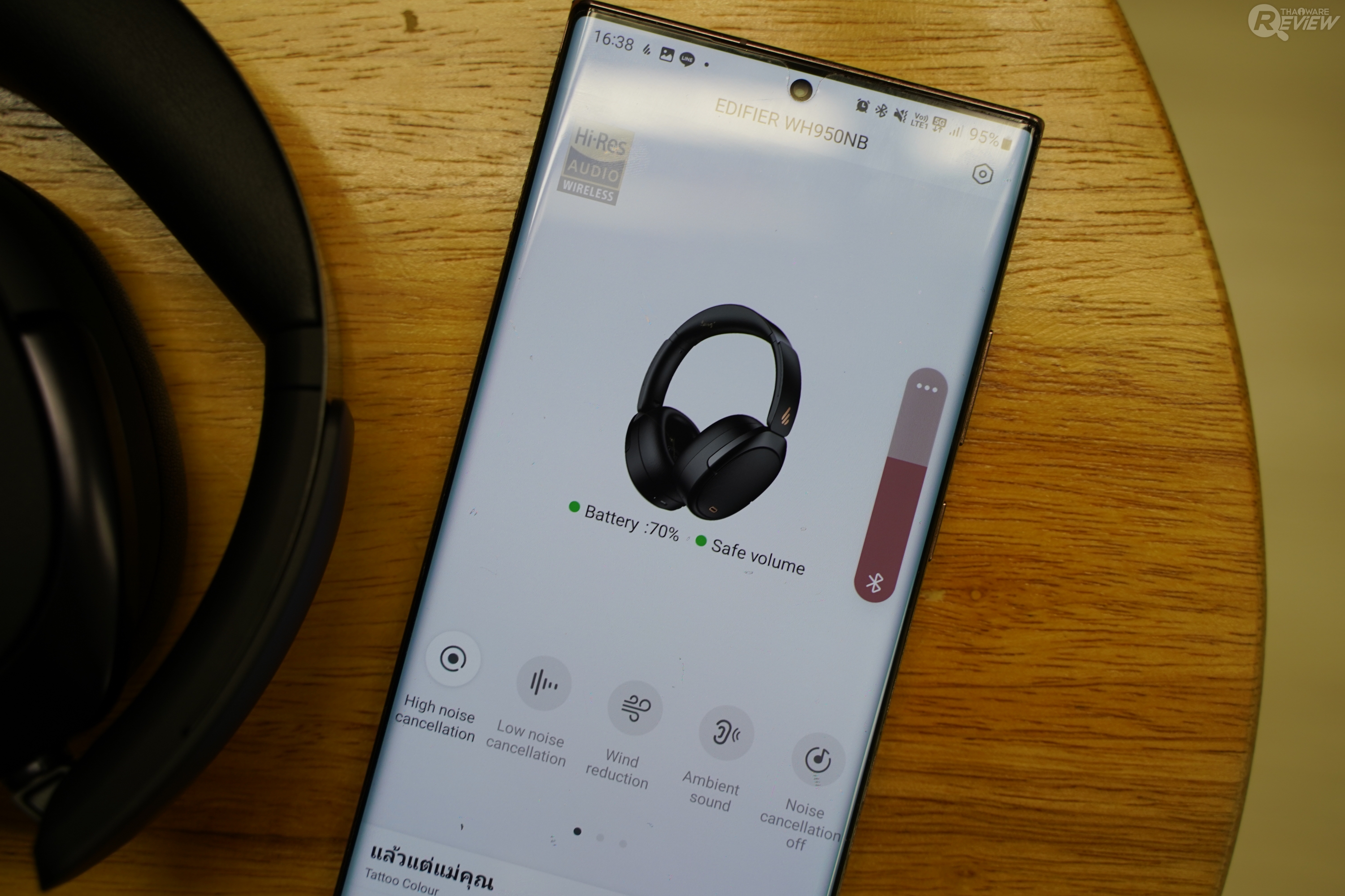 โดยการทดสอบ เน้นใช้งานโหมด High Noise Cancellation เพื่อฟังเพลงเป็นหลัก โดยหูฟัง EDIFIER WH950NB สามารถตัดเสียงรบกวนรอบข้างได้ดีมาก ๆ ถ้าใช้ในที่ทำงานที่มีคนคุยกันเบา ๆ ที่เงียบ ๆ คือตัดเสียงได้ดีจริง แต่ถ้าใช้ในที่ Outdoor เช่น ฟังเพลงอยู่ริมถนนที่มีรถวิ่งผ่าน ฟังเพลงแล้วเดินผ่านกลุ่มคนคุยกันเสียงดัง จะยังได้ยินเสียงเล็ดลอดเข้ามาบ้าง แต่ไม่รบกวนการฟังเพลง ไม่ทำให้รู้สึกว่าฟังเพลงไม่ได้แต่อย่างใด