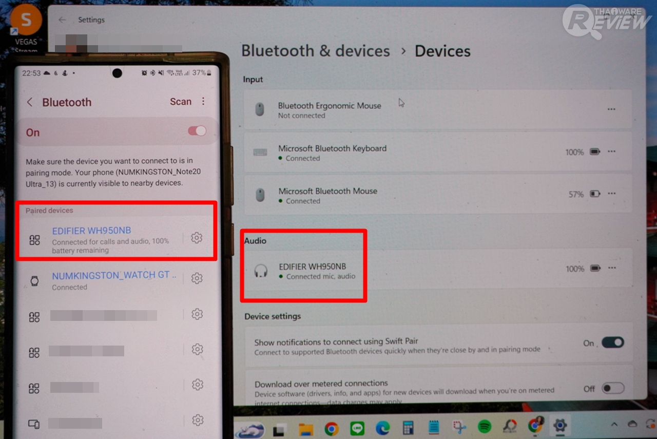 ในการทดสอบ เริ่มด้วยการดูซีรีส์บนโน้ตบุ๊คและสลับไปฟังเพลงบนมือถือ การใช้งานลื่นไหลดีมาก ไม่มีจุดใดสะดุด เราไม่จำเป็นต้องกดสลับการเชื่อมต่ออะไร สมมติฟังเพลงบนมือถือ แล้วเปลี่ยนไปเปิดหนังบนคอม หูฟังก็จะสลับแหล่งที่มาเสียงอัตโนมัติ แล้วไปเล่นอื ถ้าใครต้องการหูฟังไร้สาย ใช้งานได้หลายอุปกรณ์ หูฟังบลูทูธ EDIFIER WH950NB ก็น่าสนใจนะ