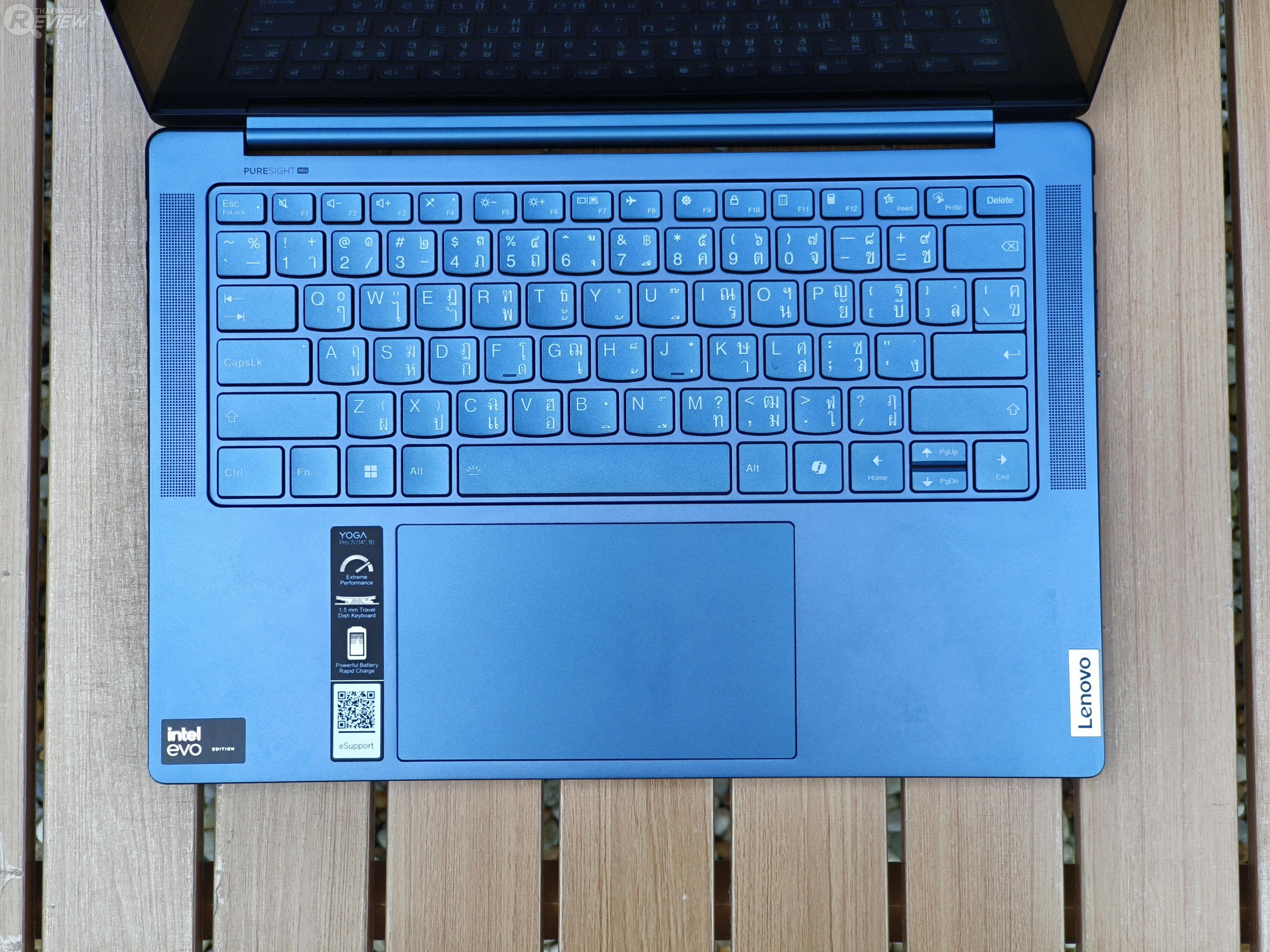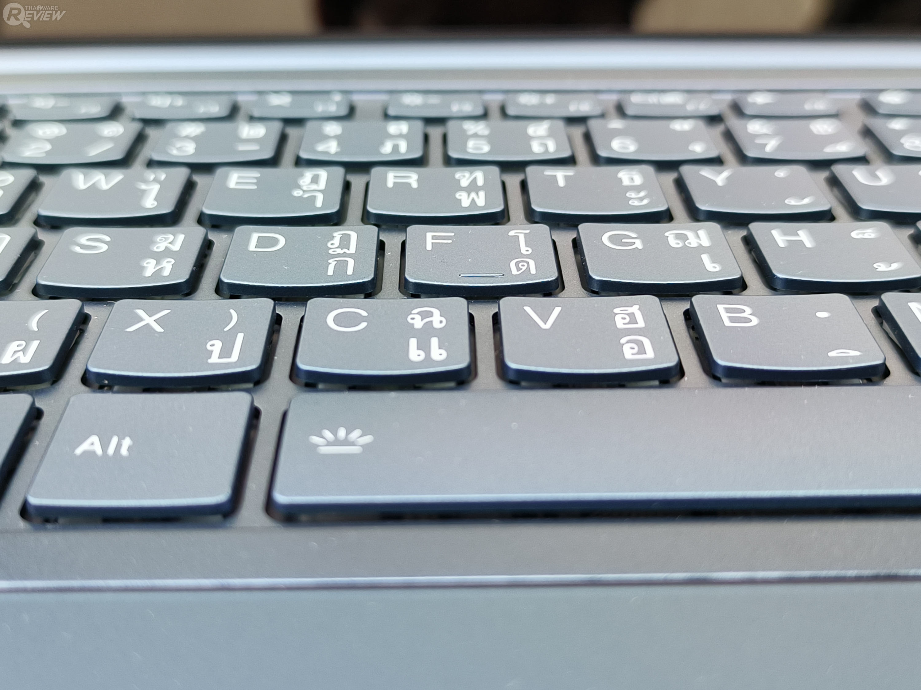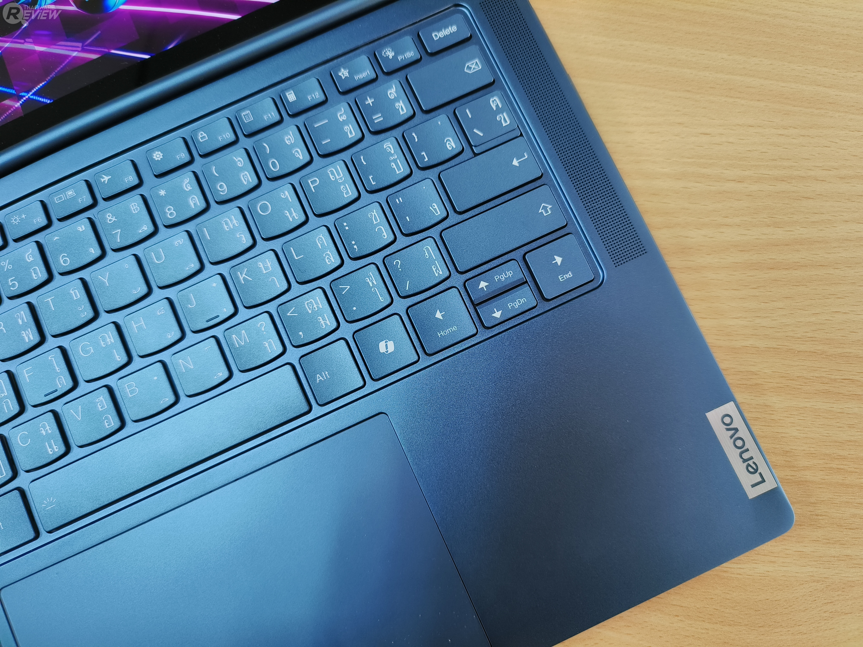 คีย์บอร์ด ใช้ปุ่มแบบ Travel Dish มีลักษณะเหมือนจาน ปุ่มเป็นแอ่งตรงกลาง ช่วยให้เวลาพิมพ์นิ้วไม่ค่อยสะกิดลั่นไปโดนปุ่มข้าง ๆ แต่ความสูง 1.5 mm ของปุ่ม ส่วนตัวแอบรู้สึกว่าสูงไปนิด ต้องกดค่อนข้างลึกเลย อันนี้อยู่ที่ความชอบ ทัชแพดกว้างมาก ขนาด 6 นิ้วด้วยกัน มีลำโพงอยู่ด้านซ้ายและขวาของแป้นคีย์บอร์ด
