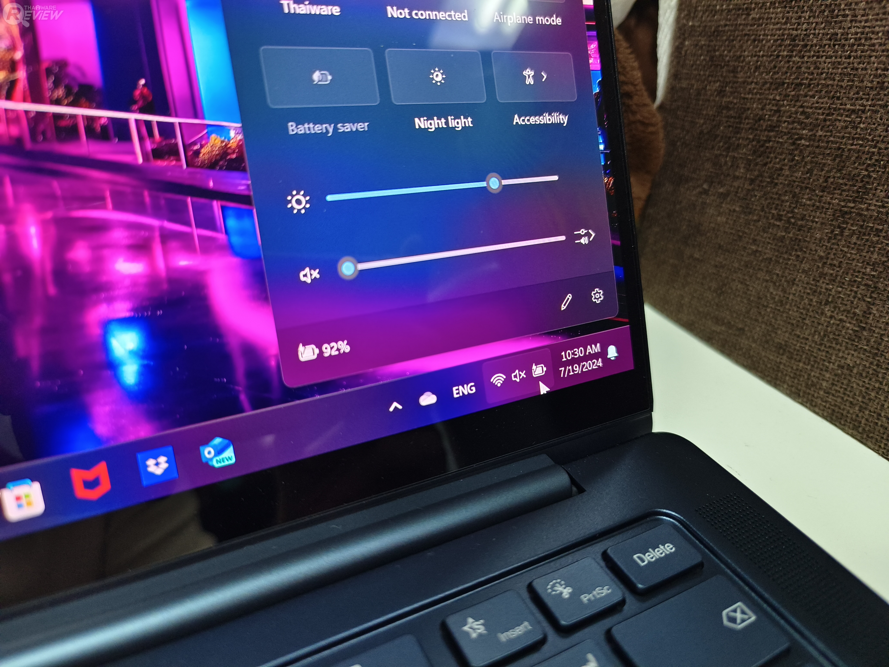 หน้าจอมีความสว่างสูงสุด 400 nits เราเอาออกไปใช้งานกลางแดด ด้วยความที่หน้าจอเป็นแบบกระจกใส การสะท้อนภาพรอบ ๆ มาบดบังการแสดงผลนี่ หลีกเลี่ยงได้ยากมาก แต่แสงสีจอก็ค่อนข้างสู้พอสมควร เราสามารถดูรายละเอียดต่าง ๆ ในจอได้ชัดเจนอยู่ดี สียังคงไม่ผิดเพี้ยนเมื่อเทียบกับแล็ปท็อปที่เคย ๆ ใช้มา แต่ไม่รู้นะว่าถ้าเป็นจอผิวด้าน (Matte) การสะท้อนอาจจะน้อยลง แต่แสงจะดรอบลงกว่านี้รึเปล่า ?
