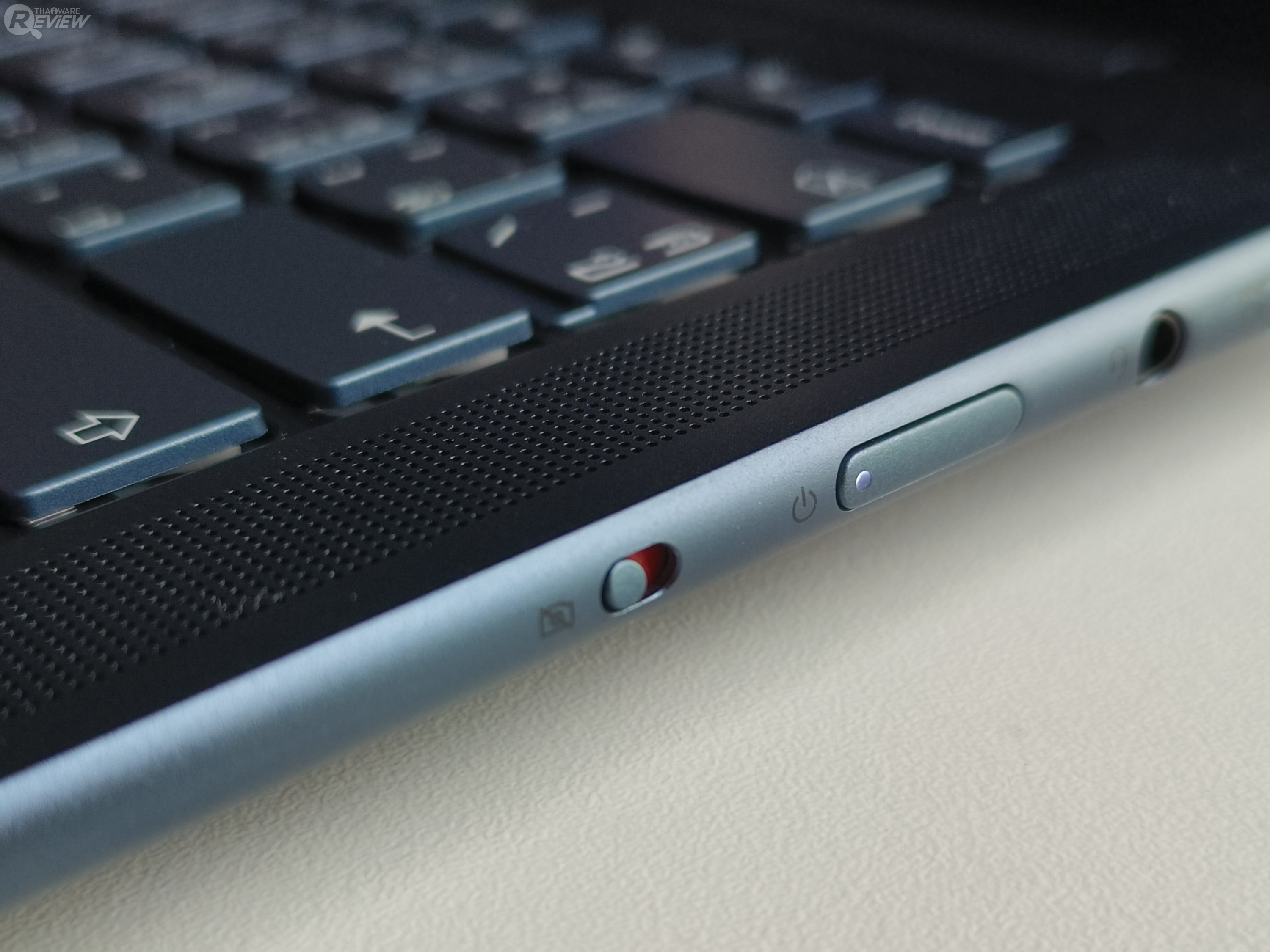 ปุ่มพาวเวอร์ ลักษณะเหมือนปุ่มมือถือ แท็บเล็ต กด Sleep เครื่องได้สะดวกสบาย สวิตซ์เปิด-ปิดกล้องเว็บแคมเพื่อความปลอดภัย อยู่ในตำแหน่งที่ถูกต้อง ดีกว่าหลาย ๆ รุ่นที่ไว้ข้างกล้องเลย