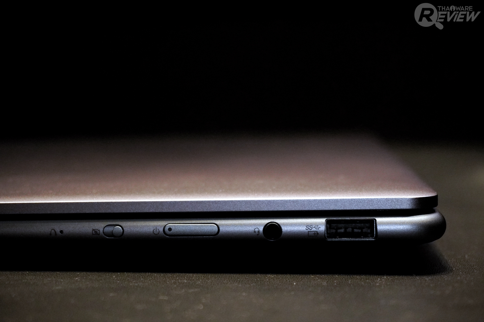 บริเวณขอบจอด้านบน มีกล้อง Webcam สำหรับ Video Conference และพื้นที่สำหรับจับเพื่อเปิดฝาพับตัวเครื่อง