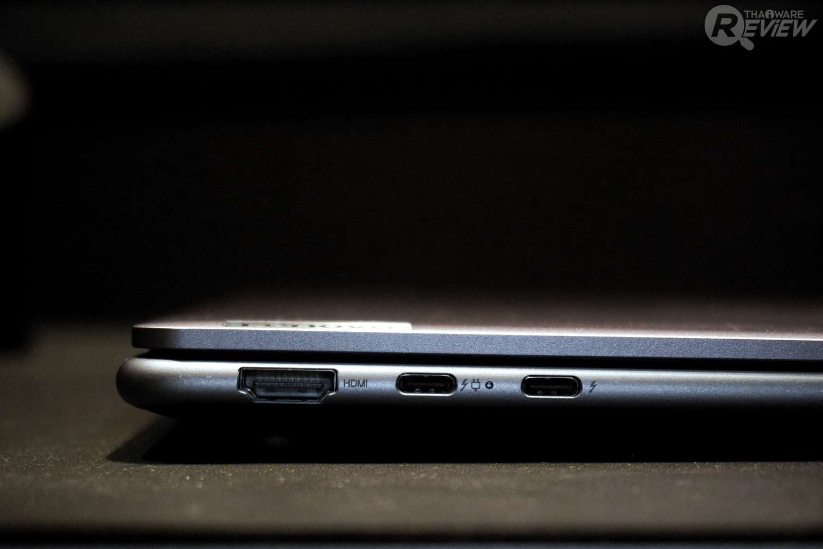 ตัวเครื่องด้านซ้าย มีพอร์ต HDMI สำหรับฉายภาพจากแล็ปท็อปเข้าหน้าจออื่น ๆ และพอร์ต Thunderbolt 4 2 ตำแหน่งสำหรับเชื่อมต่อต่าง ๆ รวมถึงชาร์จแบตเตอรี่