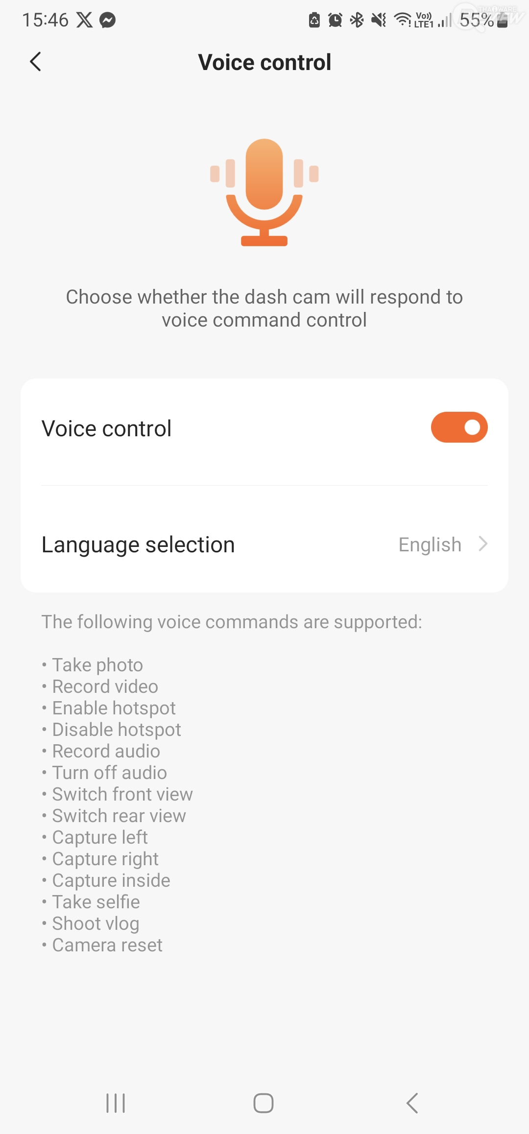 กล้องติดรถยนต์ 70mai Dash Cam 4K Omni รองรับคำสั่งเสียง (Voice Control) ได้ถึง 4 ภาษา ได้แก่ ภาษาอังกฤษ, ภาษาจีน, ภาษาอิตาเลียนและภาษาญี่ปุ่น สามารถพูดสั่งกับกล้องได้เลยโดยไม่ต้องตั้งค่าใด ๆ หรือจะปิดการใช้งานส่วนนี้ที่แอปพลิเคชัน 70mai ก็ได้เช่นกัน จากการทดสอบด้วยภาษาอังกฤษ พบว่า กล้องสามารถรับคำสั่งเสียงได้ค่อนข้างแม่นยำ ทั้งการถ่ายภาพนิ่ง วิดีโอ หรือสั่งให้หันซ้าย หันขวา หันมาถ่ายวิดีโอในรถก็ทำได้