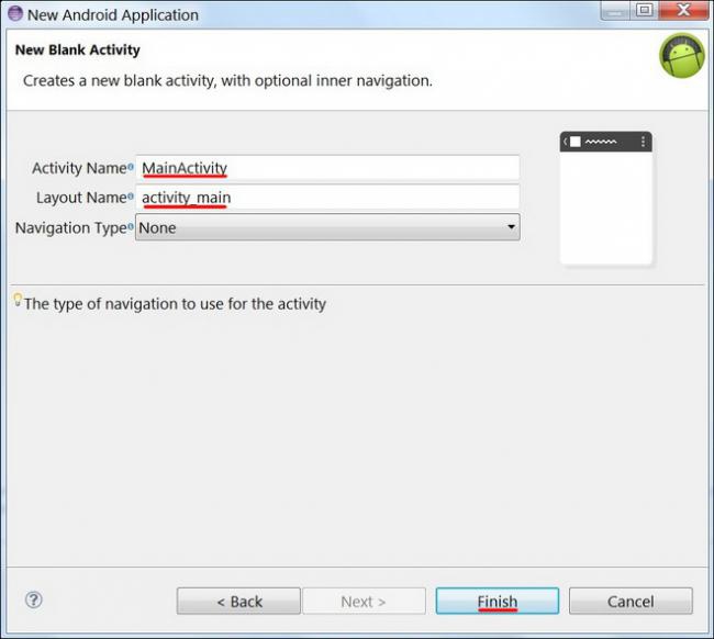 ตั้งชื่อ Activity และ Layout ที่ต้องการ เริ่มต้นยังไม่ต้องตั้งก็ได้ครับ เอาตาม Default ไปก่อน แล้วคลิก Finish เป็นการเสร็จสิ้นการตั้งค่าข้อมูลพื้นฐานของการ เขียน App Android