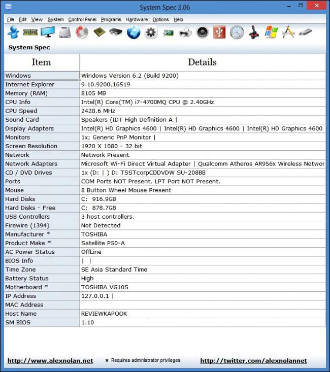 ภาพด้านบนเป็นสเปกคร่าวๆ ของ Toshiba รุ่นนี้ จากโปรแกรม "System Spec"
