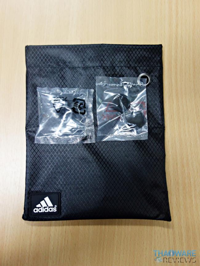 ซองสำหรับใส่หูฟังมีโลโก้ Adidas ด้านหลังเป็นโลโก้ Sennheiser แถมยังมีฟองน้ำ และตัวหนีบกับเสื้อมาให้ด้วยเน้อ