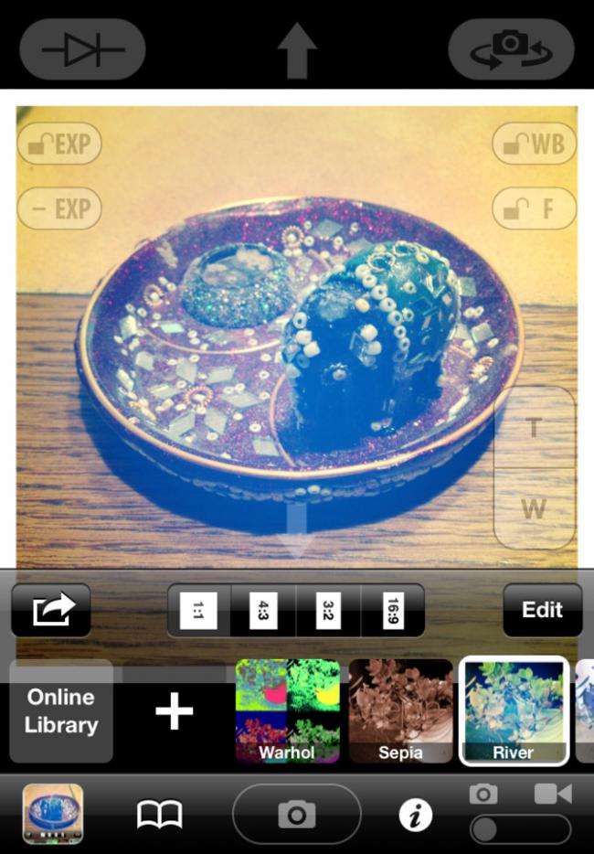 เริ่มต้นด้วยการเปิดแอปขึ้นมา เราก็จะเจอหน้าตาโปรแกรมแบบนี้ ซึ่งหลักๆ ก็จะมี ปุ่มสลับกล้องหน้า/หลัง, ปุ่มเปิด/ปิดแฟลช, ปุ่มล็อกตำแหน่งจุดโฟกัสภาพ(F), WhiteBalance(WB), Exposure(EXP), ปุ่มซูมภาพ(T/W), Online Library, ปุ่งเพิ่ม Filter, ปุ่มเปิด/ปิดหน้าต่าง Effect, ตั้งค่า และ ปุ่มสลับกล้องถ่ายรูปกับวิดีโอ