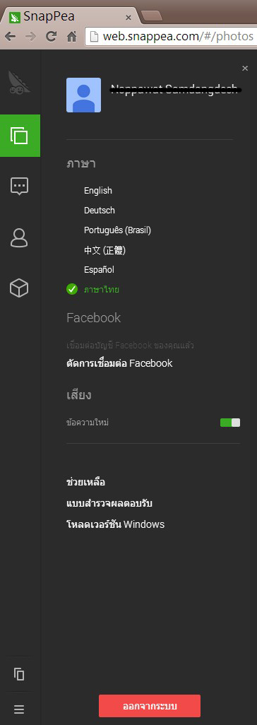 สำหรับส่วนสุดท้ายของ SnapPea บนหน้าเว็บ เป็นหน้าเกี่ยวกับการตั้งค่าภาษา การเชื่อมต่อกับ Facebook โหลดเวอร์ชัน Windows และออกจากระบบ แนะนำว่าถ้าเลิกใช้แล้ว ก็ควรที่จะออกจากระบบด้วยนะ