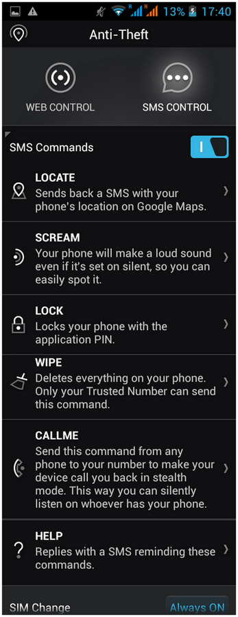 Trusted Number : คุณสามารถเปลี่ยนเบอร์โทรของบุคคลอื่น สำหรับการส่ง SMS แจ้งเตือนไปยังหมายเลขอื่นๆ เพื่อใช้ในการควบคุม และตรวจสอบ ในเวลาที่โทรศัพท์เกิดหายไป หรือถูกโจรกรรมไป ตามรูปข้างล่างนี้