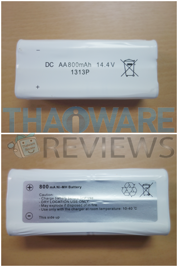 แบตเตอร์รี่ของเจ้าตัวเล็กนี้ มีพลังไฟที่ 14.4 V ปริมาณของแบตเตอร์รี่ตัวนี้อยู่ที่ 800 mA ซึ่งแบตเตอร์รี่ตัวนี้ ควรเก็บไว้ที่อุณหภูมิห้องที่ 10 - 40 องศาเซลเซียส ห้ามโดนน้ำ และเจ้าแบตเตอร์รี่ตัวนี้อาจเกิดการระเบิดได้ เมื่อมันไปสัมผัสกับไฟ หรือถูกไฟไหม้