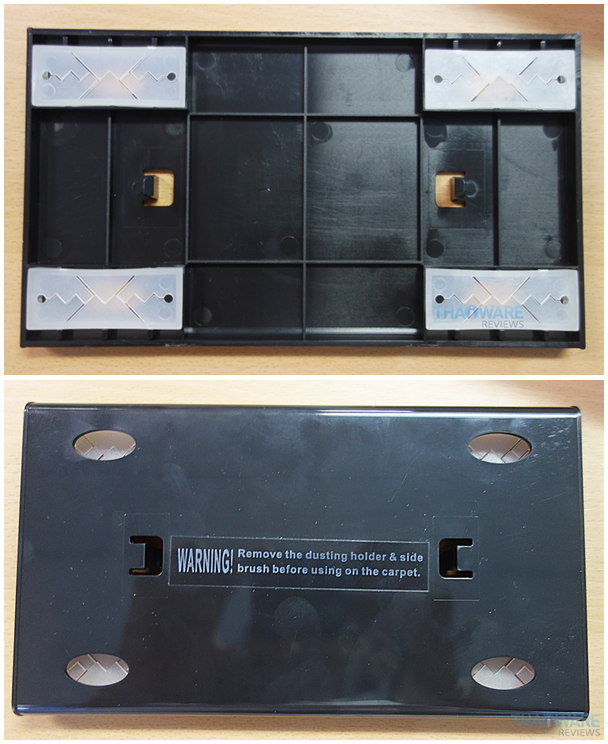 ถาดรองกระดาษทำความสะอาด หรือถาดใส่กระดาษเช็ดพื้น ตรงนี้หากใครที่ต้องการดูดฝุ่น บนพื้นกระเบื้อง พื้นไม้ปาร์เก้ ไม้ยาง ต่างๆ จะต้องติดถาดรองกระดาษทำความสะอาดเอาไว้ แต่หากต้องการที่จะดูดฝุ่นบนพรม จะต้องแกะถาดรองกระดาษทำความสะอาดออกไปก่อนการใช้งาน เจ้าถาดรองกระดาษตัวนี้มันจะติดตั้งมาให้กับตัวเครื่องอยู่แล้ว เรามีหน้าที่ต้องแกะออกมาติดตั้งแผ่นทำความสะอาดด้วยตัวเอง วิธีการติดตั้งก็ไม่ยากเลย เพียงแค่กดกระดาษดักฝุ่น หรือ กระดาษทำความสะอาดเข้าไปในช่องทั้ง 4 มุม ให้บุ๋มลงไป (แนะนำว่าถ้าใครมีเล็บก็ควรใช้เล็บกดไปเลยดีที่สุด) ซึ่งทางบริษัทผู้จัดจำหน่ายมีกระดาษให้เลือกอยู่ 2 ชนิดด้วยกัน คือกระดาษเปียก กับกระดาษแห้งซึ่งหลักการทำงานก็จะเหมือนกัน แต่การทำงานจริง ในส่วนตัวคิดว่าถ้าใช้กระดาษเปียกจะดีกว่า เพราะมันจะเป็นการถูพื้นไปในตัว เรียกได้ว่า 2 IN 1 กันเลย ได้ทั้งกวาด และถู สบายๆ อย่าบอกใคร