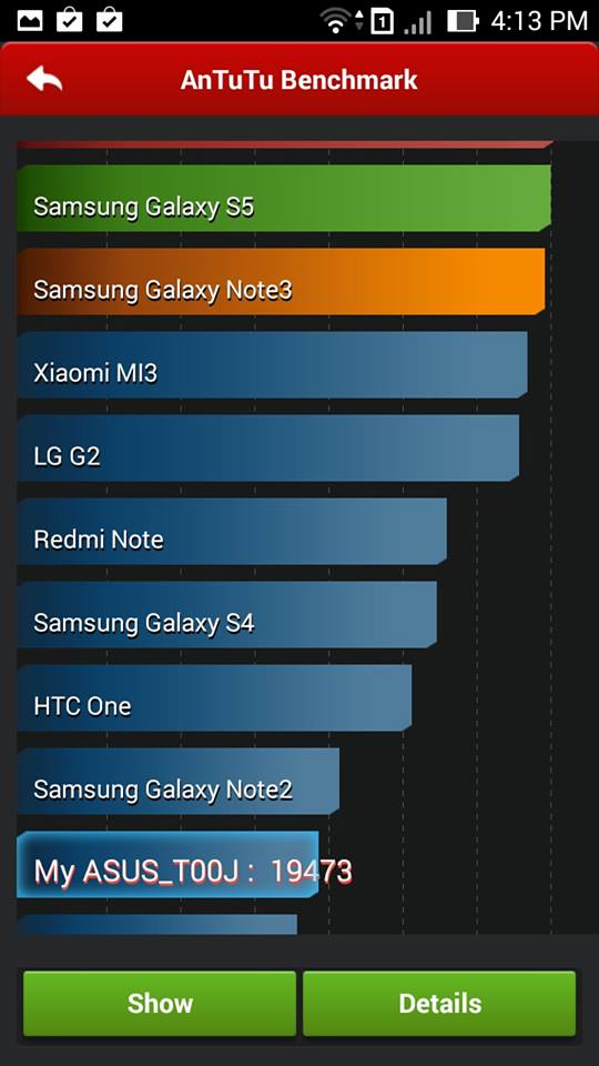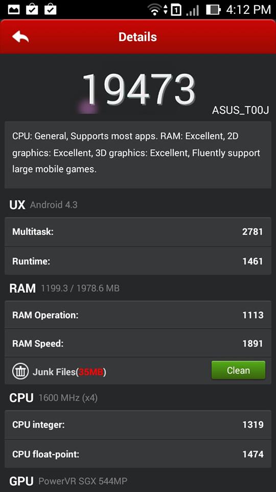 ถือว่าคะแนนออกมาปานกลางไม่แรงแต่ก็ไม่ช้าจนน่าเกลียดด้วยการทดสอบนี้คงชี้ได้ว่าการใช้งานปกติและ 3 มิติ รวมถึงการใช้แรมจากเครื่องที่รีดออกมาได้ดีทีเดียว ส่วนการเล่นแอปพลิเคชันทั้งหลาย ก็ยังมีสะดุดหรือกระตุกเล็กๆ หากไม่ได้สังเกตจริงจังก็ไม่ค่อยเห็นความแตกต่างเท่าไร