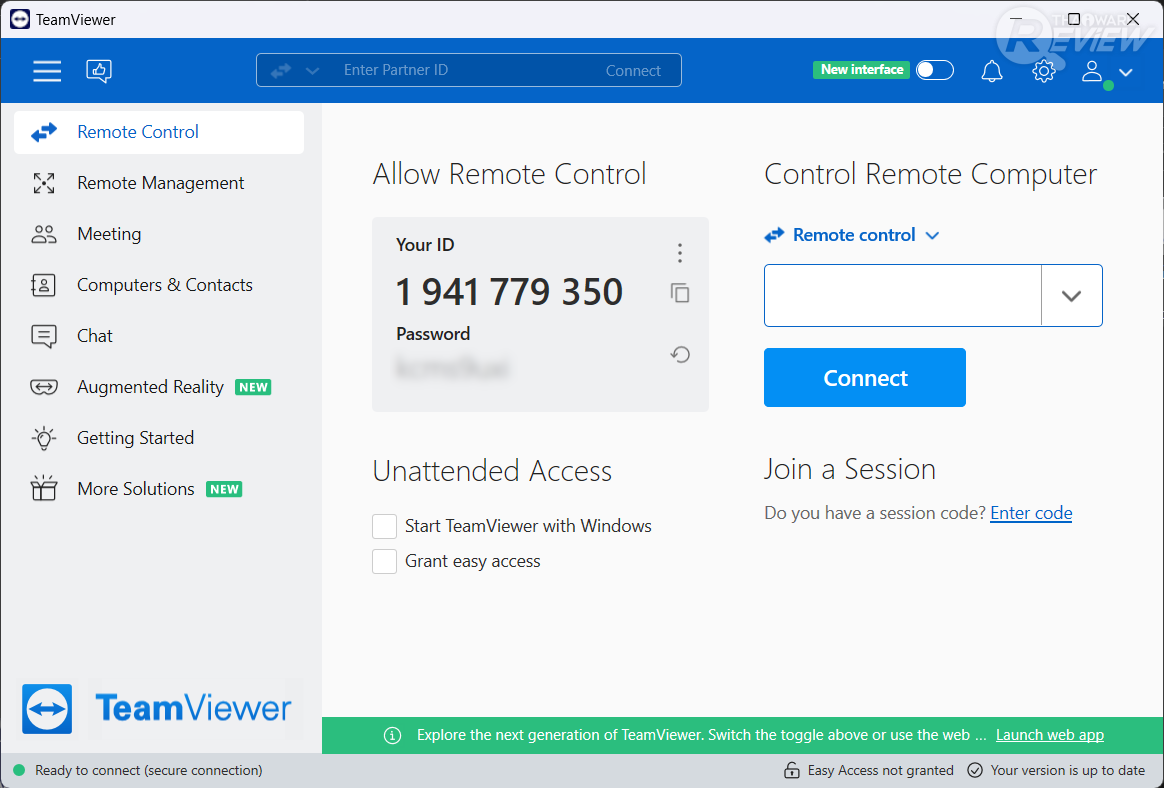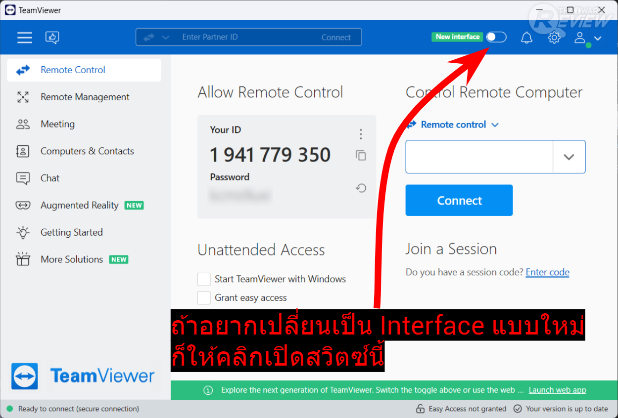 โดยในหน้าจอหลัก Interface แบบเก่า (ของโปรแกรม TeamViewer Remote เวอร์ชันล่าสุด) จะมีสวิตซ์เลื่อน New Interface ปรากฏอยู่ ให้ทำการคลิกเปิดสวิตซ์ จากนั้นโปรแกรมก็จะ Restart ตัวเอง แล้วเปิดขึ้นมาเป็น Interface แบบใหม่ทันที