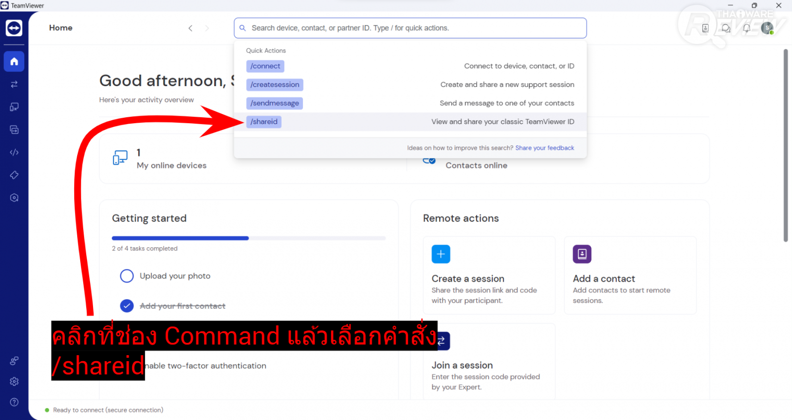 นอกจากช่องพิมพ์คำสั่ง Command จะมีประโยชน์ในการเริ่มต้นเข้าควบคุมจากระยะได้อย่างรวดเร็วแล้ว ก็ยังช่วยให้เราสามารถแชร์ ID และรหัสผ่าน ไปให้เจ้าหน้าที่ IT Support ที่ต้องการเข้ามาควบคุมเครื่องของเราได้อย่างรวดเร็ว โดยการใช้คำสั่ง /shareid