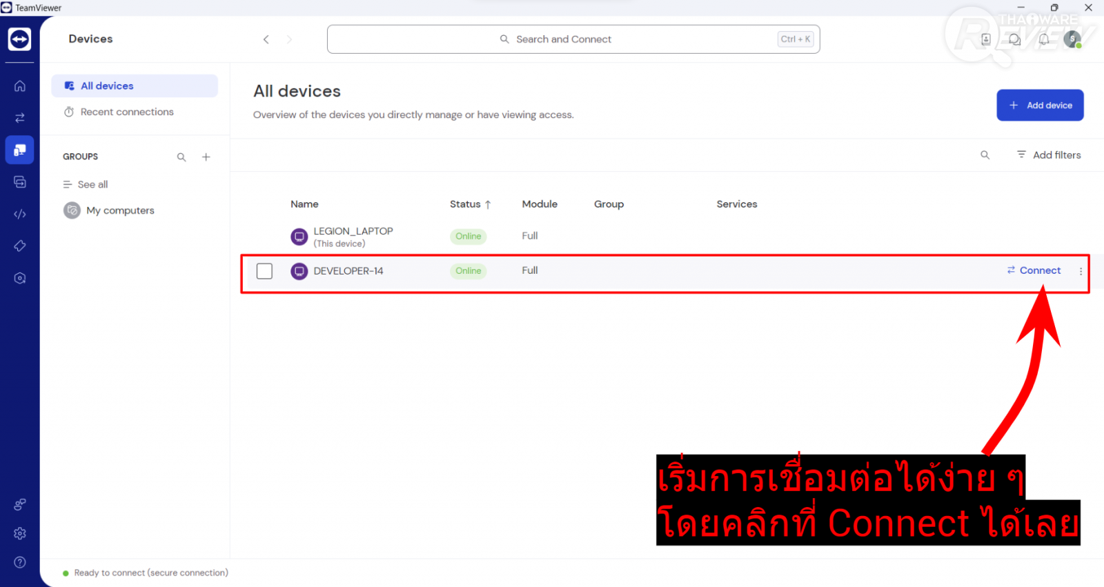 เมื่ออุปกรณ์ที่เราต้องการเชื่อมต่อเพื่อเข้าควบคุมจากระยะไกล อยู่ในรายชื่อ Managed Devices เรียบร้อยแล้ว การเชื่อมต่อเข้าไปก็ทำได้ง่าย ๆ ด้วยการคลิกที่ "ปุ่ม Connect" ของอุปกรณ์นั้นได้เลย