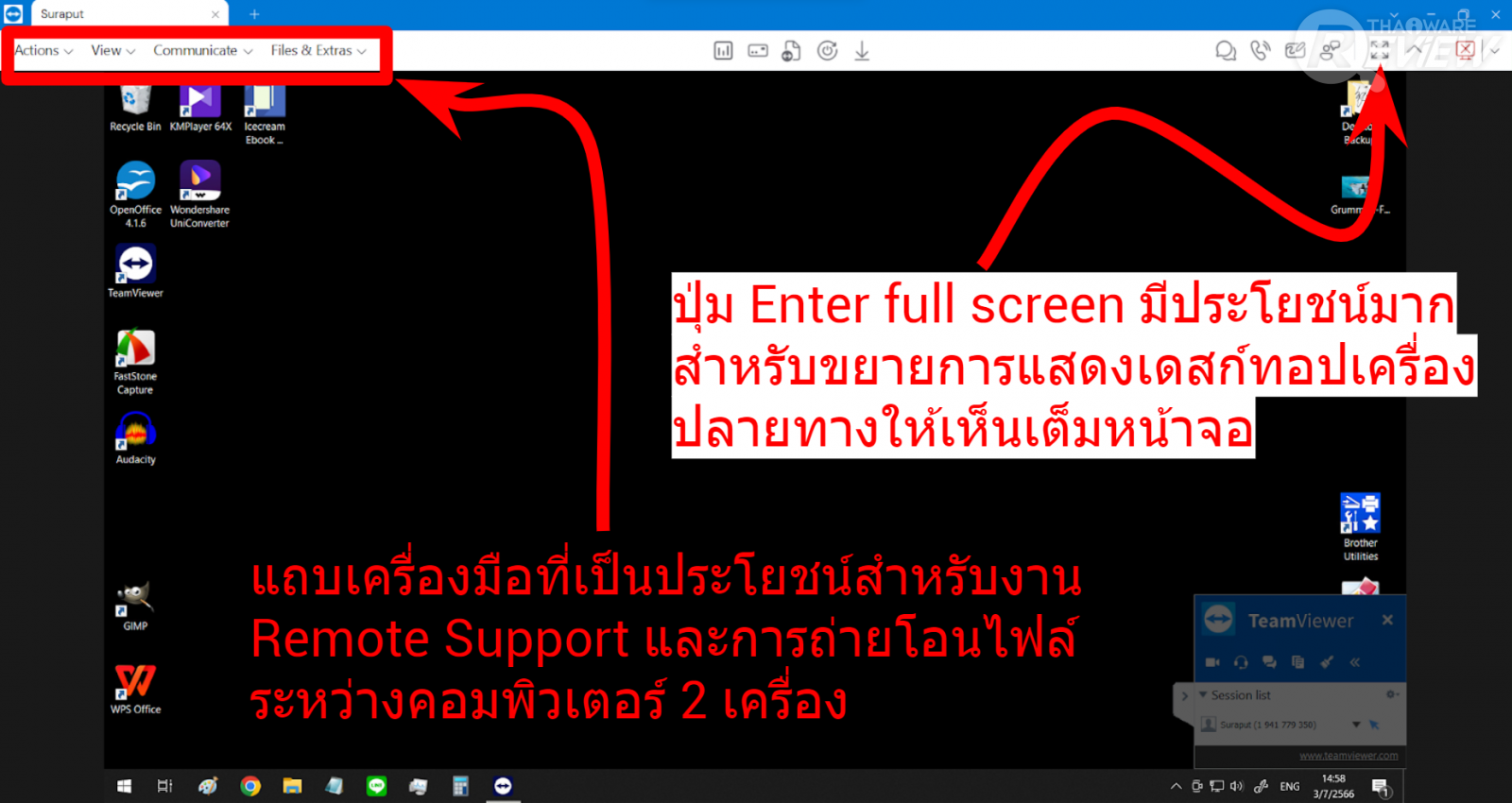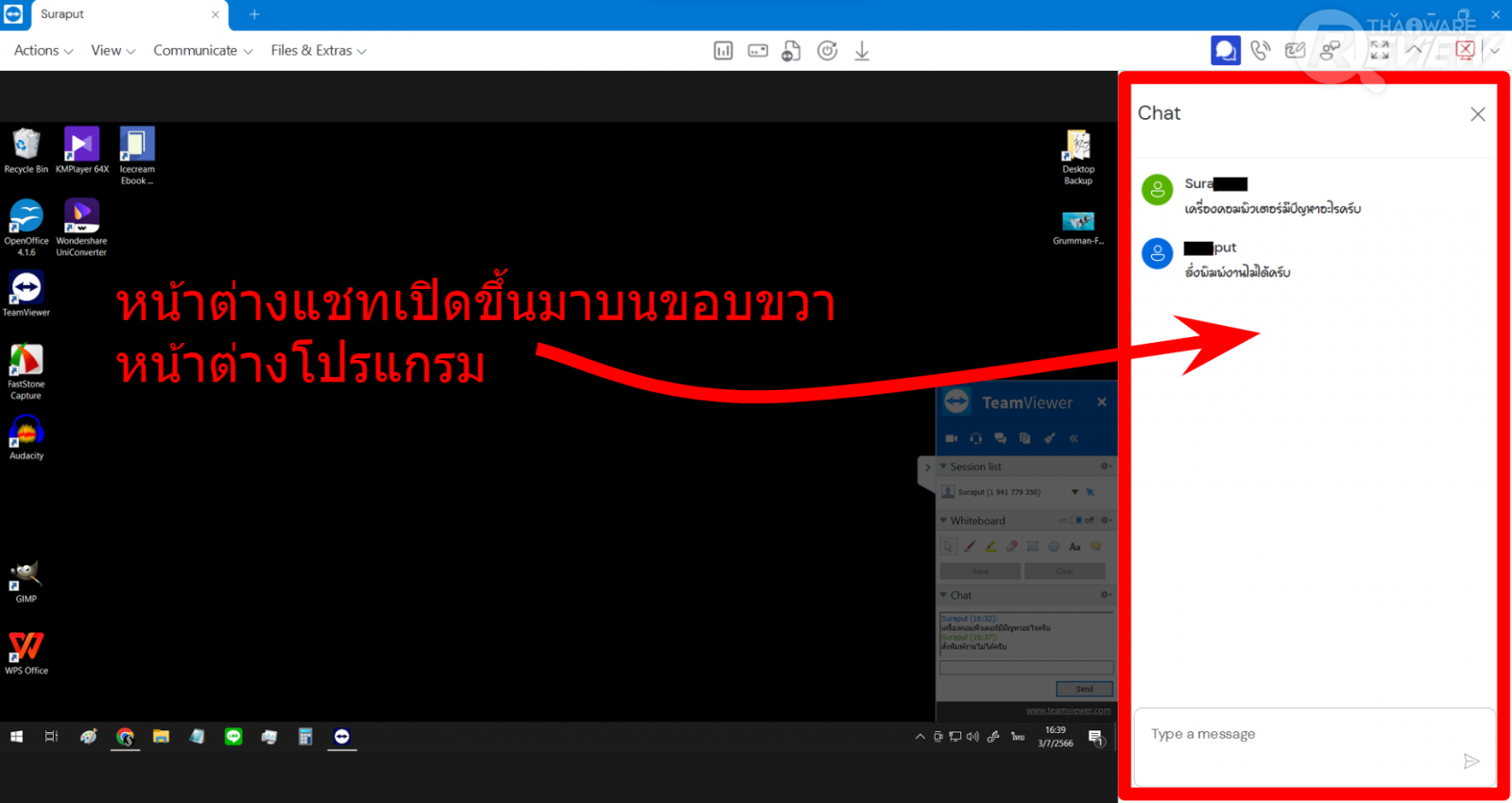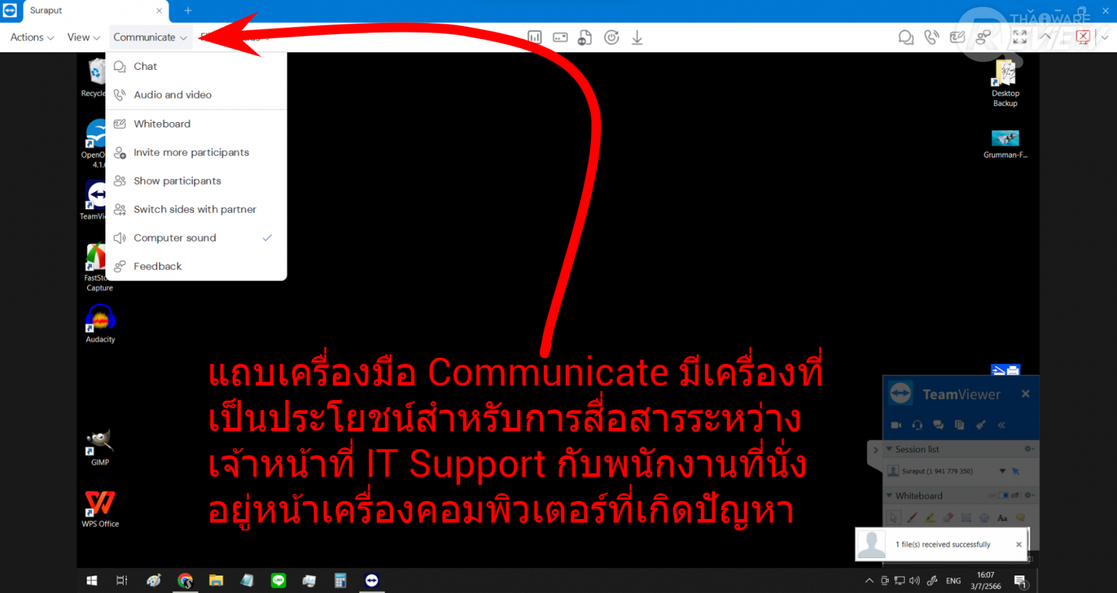 ในส่วนของ "แท็บ Communication" ก็ยังมี "คำสั่ง Whiteboard" ที่ช่วยให้ทางฝั่ง IT Support สามารถเขียนลากเส้นบนหน้าจอ หรือพิมพ์อักษรบนหน้าจอ ให้ไปปรากฏบนหน้าจอของทางฝั่งพนักงาน เพื่อให้คำแนะนำในการแก้ไขปัญหา
