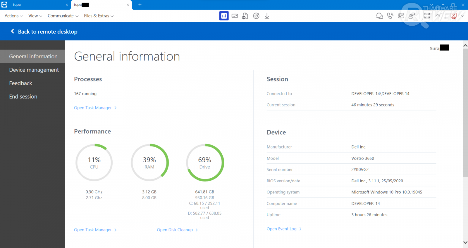 คำสั่ง Dashboard ในแถบเครื่อง Files & Extras เป็นการเรียกเปิดแผงควมคุมที่แสดงรายละเอียดทางเทคนิคของเครื่องที่เราทำการ Remote เข้าไป ข้อมูลเหล่านี้เป็นประโยชน์ให้เจ้าหน้าที่ IT Support สามารถวิเคราะห์สาเหตุของปัญหาที่เกิดขึ้นได้อย่างรวดเร็ว โดยข้อมูลที่แสดงก็มี อาทิ