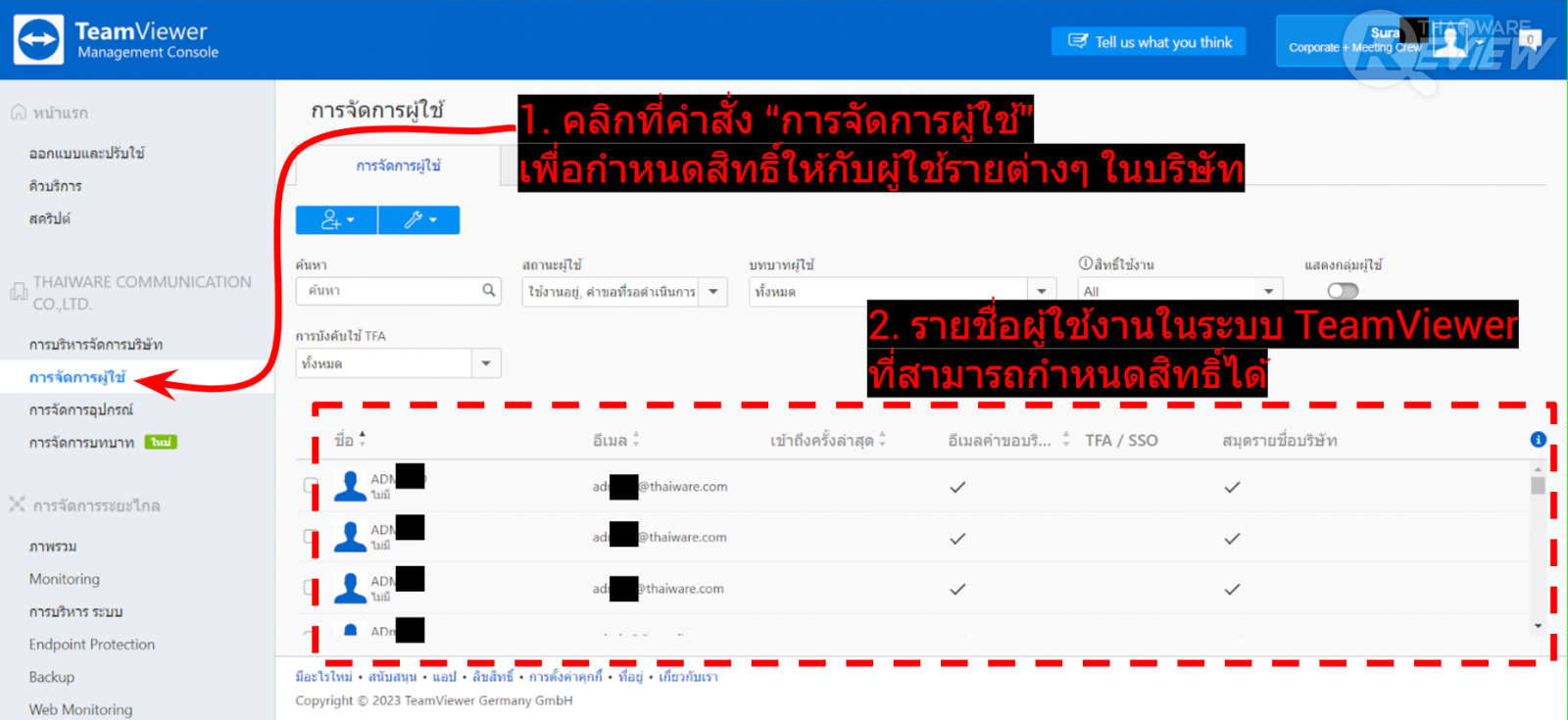 ก็จะมีการเรียกเปิดหน้าเว็บของ TeamViewer Management Console ขึ้นมาตามภาพด้านบน และในกรณีที่เราเป็นผู้ดูแลระบบ (Administrator) เราจะสามารถกำหนดสิทธิ์การใช้งานโปรแกรม TeamViewer ให้กับผู้ใช้รายอื่น ๆ ที่อยู่ในบริษัทเดียวกันกับเราได้