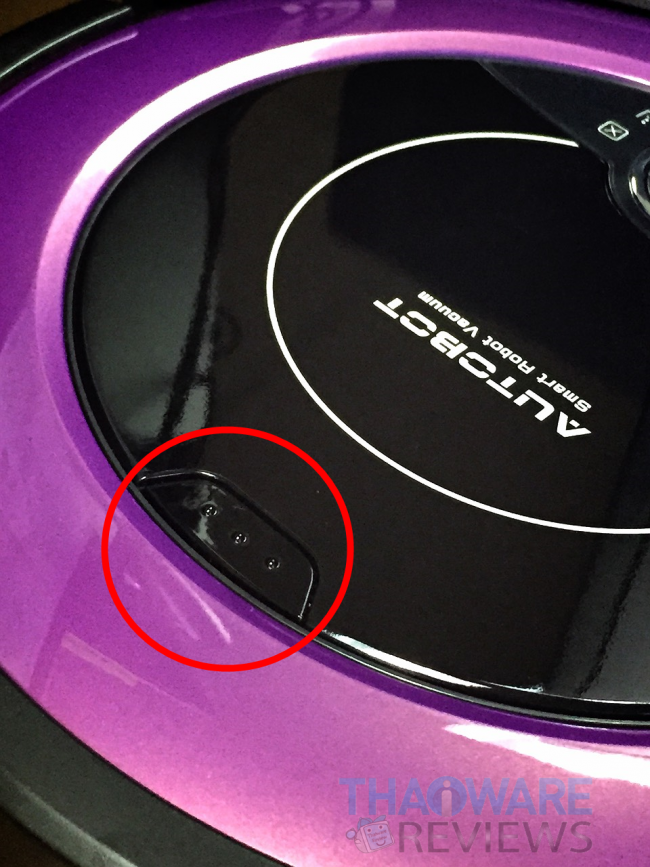 ส่วนปุ่มสวิตช์ที่เห็นอยู่เป็นสวิตช์เปิด - ปิดการทำงานของหุ่นยนต์ดูดฝุ่น ช่องเล็กๆ ถัดมากจากปุ่มสวิตช์คือช่องสำหรับเสียบสายชาร์จแบบ Adaptor