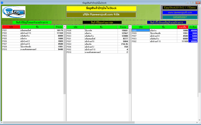 เมื่อกดคลิกเข้ามาที่ตัวโปรแกรมนี้แล้วจะพบกับหน้าต่างโปรแกรมแบบนี้ โดยในส่วนกลางจะแสดงถึงข้อมูลสินค้าในสต๊อกที่แบ่งออกมาเป็น สินค้าทั้งหมด, สินค้าที่มียอดจำหน่ายมากสุด และสินค้าที่ใกล้หมด