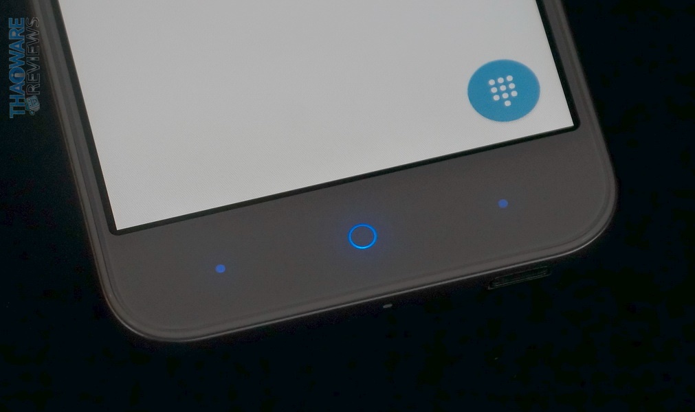 ปุ่มด้านล่าง คือ ปุ่ม Home และมีปุ่มซ่อนอยู่ซ้ายและขวา มีไฟสีฟ้าสวยดีครับ เราสามารถปรับหน้าที่ของปุ่มนี้ได้ในการตั้งค่า