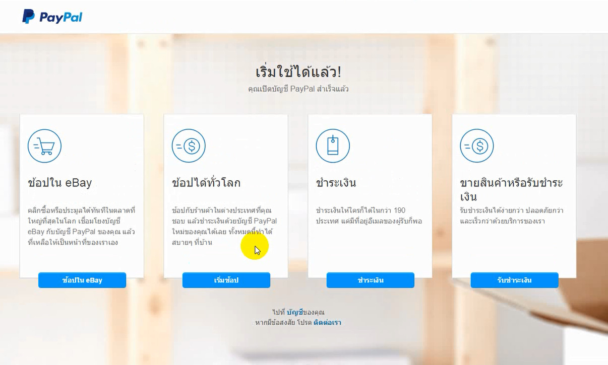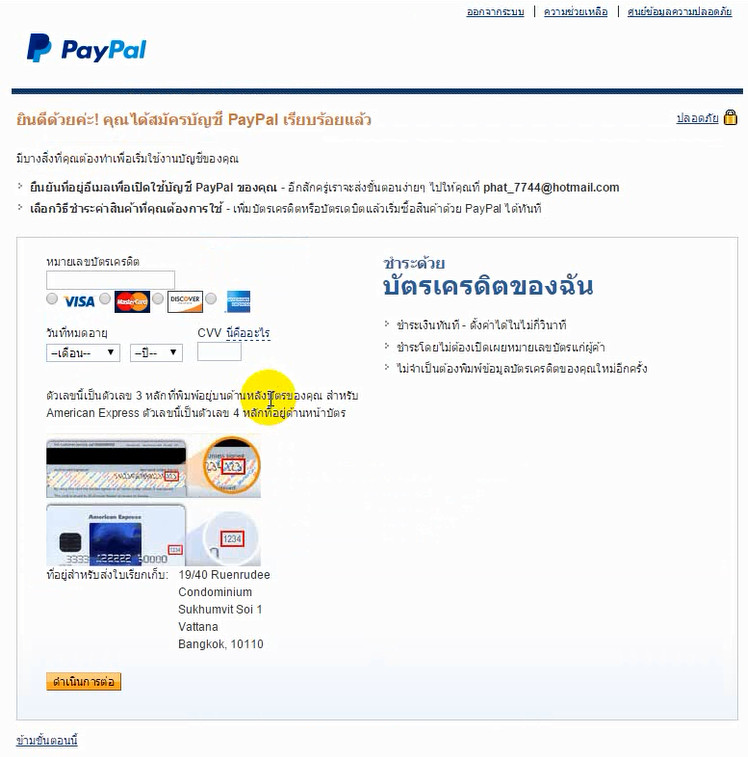 6. เป็นการเสร็จสิ้นขั้นตอนการสมัคร จากนั้นให้ไปที่อีเมลของเพื่อนๆ จะได้รับจดหมายยืนยันอีเมลดังรูป ให้กด 'เปิดบัญชีของฉัน' เป็นอันเสร็จขั้นตอนการสมัคร หลังจากนั้นทาง PayPal จะทดลองหักเงินบางจำนวนจากบัตรเราและคืนเงินให้ทันที