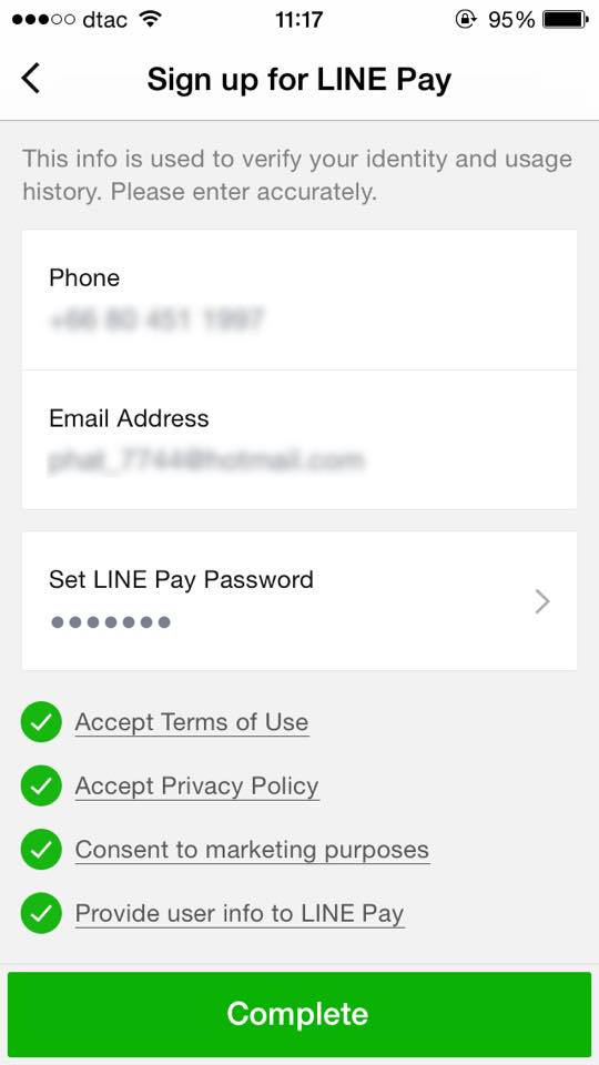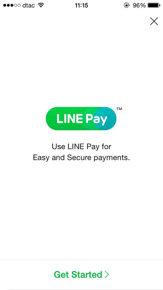 2. สมัครเข้าใช้ LINE Pay โดยกดที่ Get Started จากนั้นกรอกหมายเลขโทรศัพท์ อีเมล ตั้งรหัสผ่าน 7 หลัก ติ้ก Accept ทั้งหมด จากนั้นกด Complete