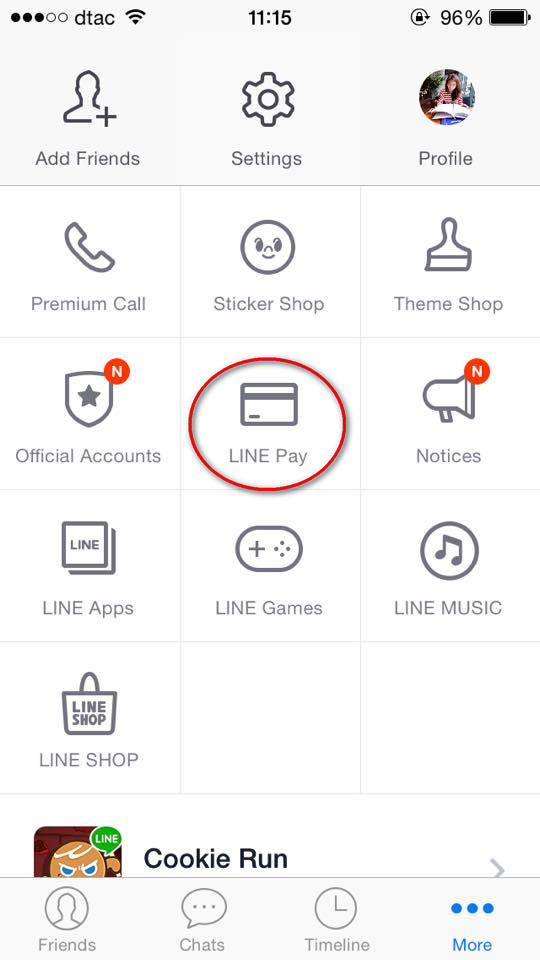 1. ให้เข้าไปที่แอปพลิเคชัน LINE ของเพื่อนๆ แล้วไปที่หน้า More จะเห็น แอปพลิเคชัน LINE Pay ให้กดเข้าไป