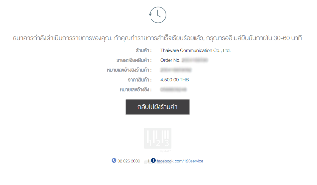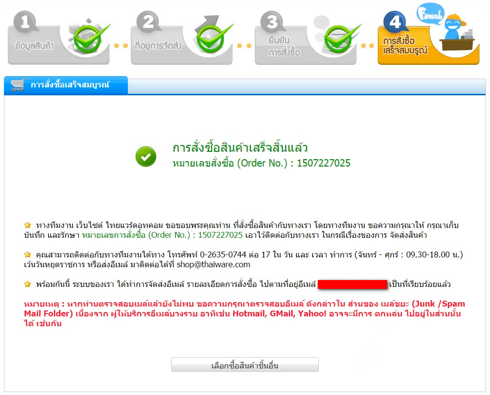 เมื่อยืนยันการชำระเงินเสร็จเรียบร้อย ให้กดปุ่ม “Back to Merchant” ระบบจะทำการส่งกลับมาที่เว็บไซต์ไทยแวร์อีกครั้ง และจะปรากฎหน้าต่างตามรูปด้านบนขึ้นเพื่อยืนยันรายละเอียดการชำระเงิน เมื่อทำการชำระเงินกับทางธนาคารเสร็จเรียบร้อยแล้ว จะมีอีเมลล์ส่งหลักฐานการชำระเงินเข้าไปยังอีเมลล์ที่ได้ระบุไว้ในขั้นตอนสั่งซื้อสินค้า