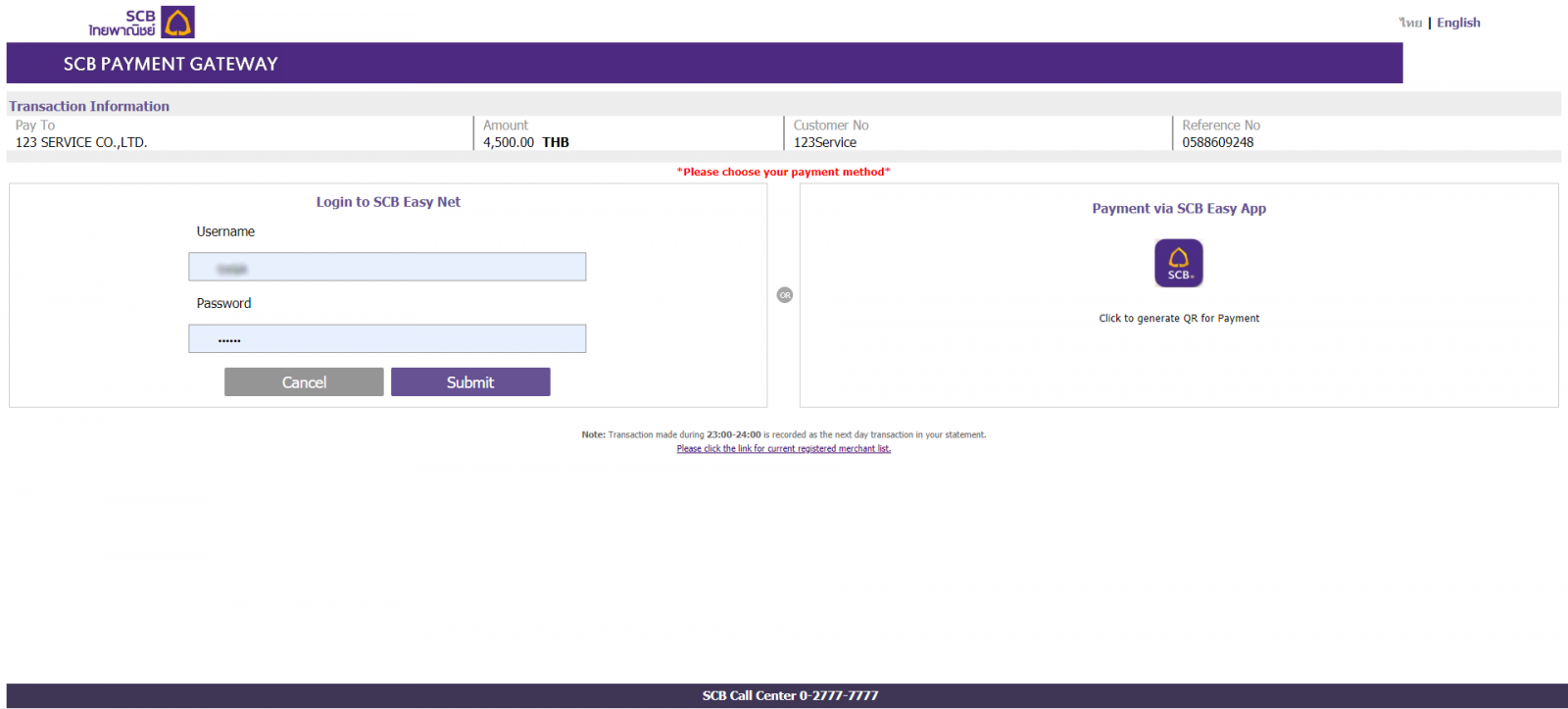 ระบบจะนำเพื่อนๆ เข้าสู่หน้าเว็บไซต์ของธนาคารที่เลือก ให้เพื่อนๆ ทำการล็อกอินเข้าสู่ระบบด้วยชื่อผู้ใช้และรหัสผ่านที่ได้ลงทะเบียนไว้กับทางธนาคาร และหลังจากล็อกอินเสร็จเรียบร้อย ให้กดยืนยันชำระเงิน