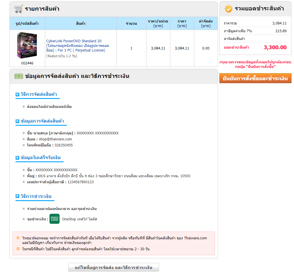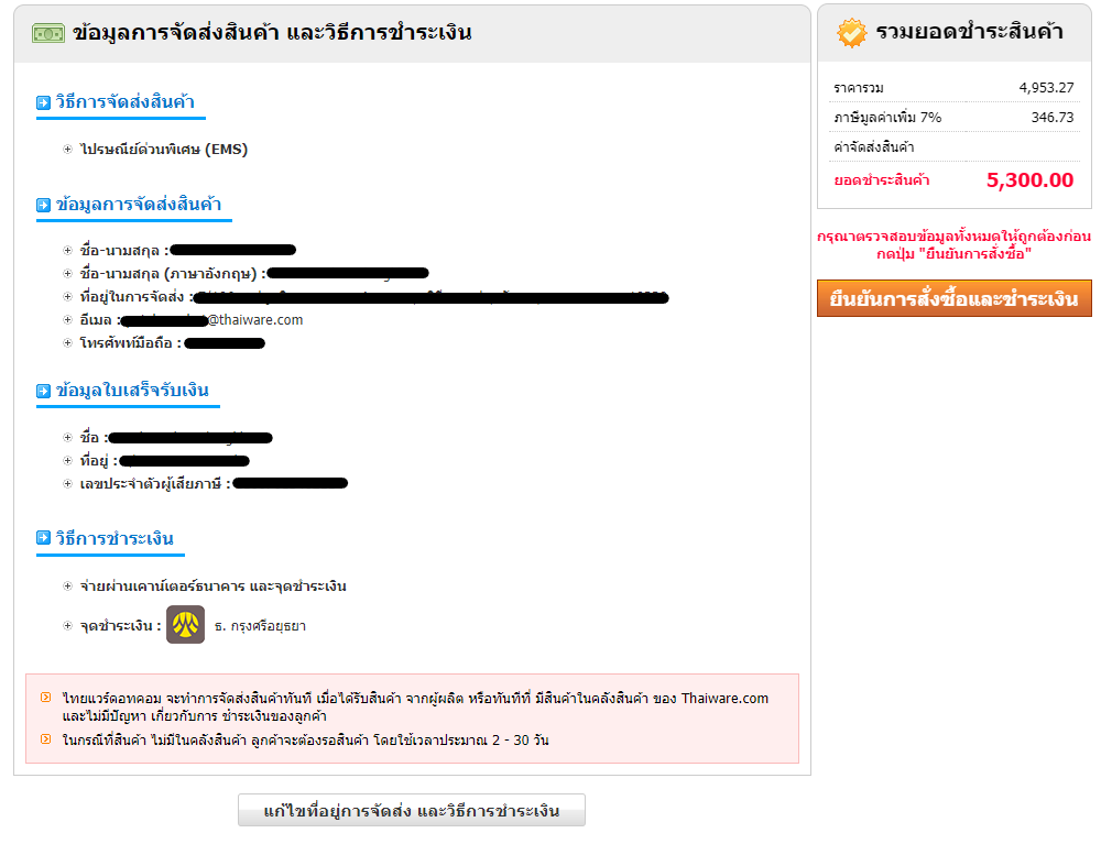 เมื่อเข้าสู่หน้าข้อมูลการจัดส่งสินค้า และวิธีการชำระเงิน ให้ตรวจสอบข้อมูลอีกครั้ง หากมีข้อมูลใดผิดพลาด ให้กดปุ่ม “แก้ไขที่อยู่การจัดส่งและวิธีการชำระเงิน” เพื่อกลับไปแก้ไขข้อมูล แต่หากข้อมูลถูกต้องแล้ว ให้กดปุ่มสีส้ม “ยืนยันการสั่งซื้อและชำระเงิน” เพื่อเข้าสู่กระบวนการชำระเงินกับธนาคารที่เลือกไว้