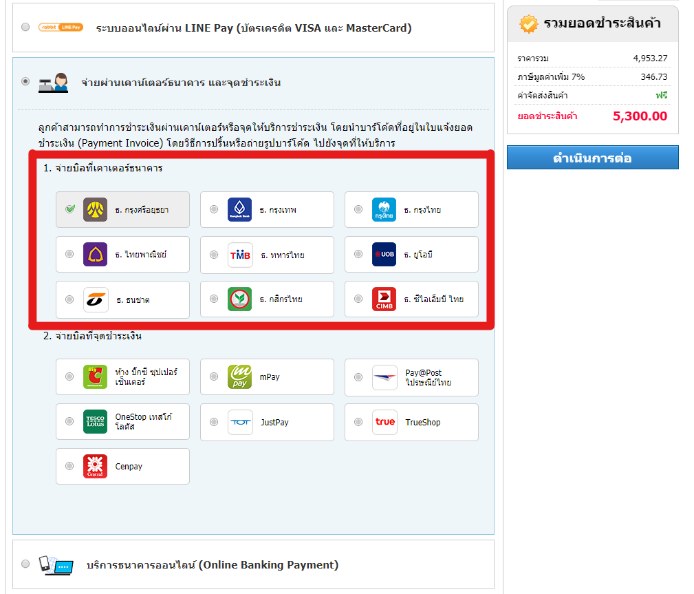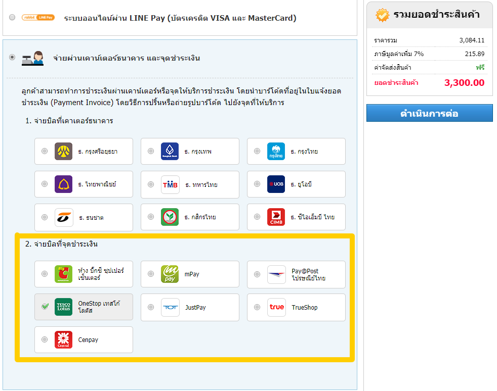 หากต้องการจ่ายค่าสินค้าที่เคาน์เตอร์ธนาคาร ให้เลือกธนาคารที่ต้องการ แล้วกดปุ่มดำเนินการต่อ