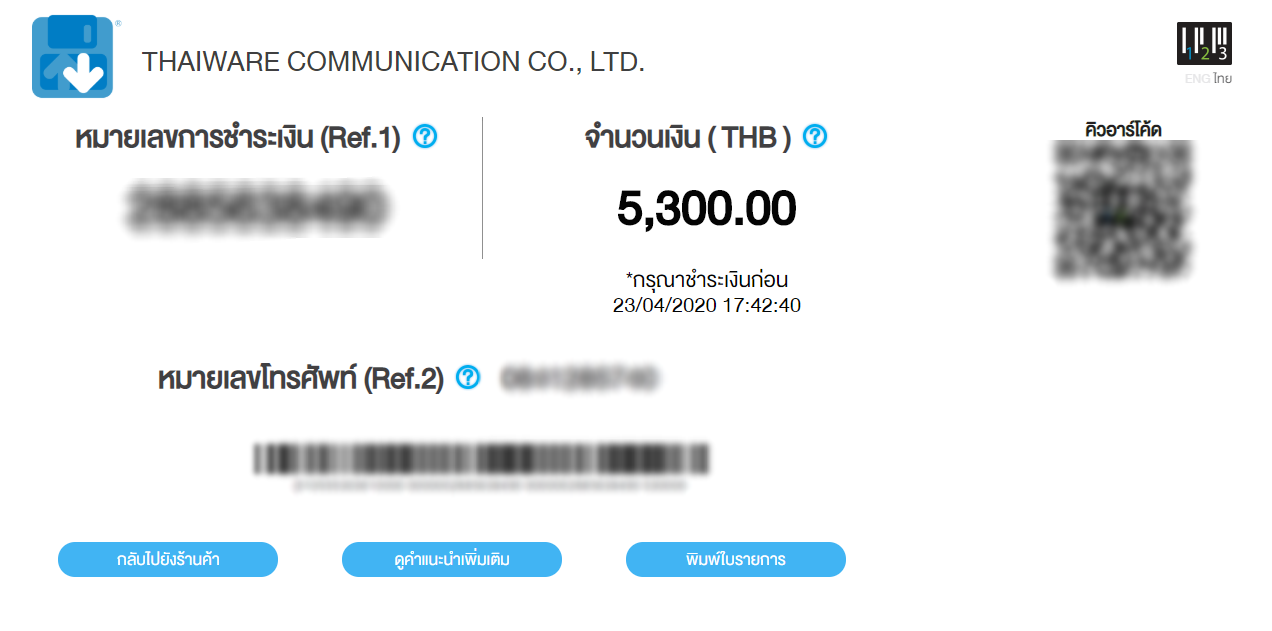 หากเพื่อนๆ เลือกช่องทางในการชำระเงินเป็นการชำระเงินผ่านระบบเคาน์เตอร์เซอร์วิส เมื่อกดยืนยันการสั่งซื้อ ระบบจะลิงค์ไปยังหน้าใบแจ้งการชำระเงิน ที่มีบาร์โค้ดและรหัส 15 หลักใต้บาร์โค้ด