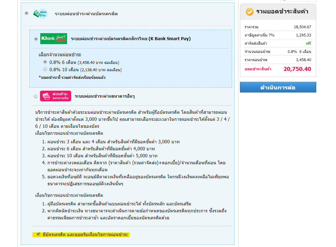 หากเพื่อนๆ เลือกจ่ายแบบผ่อนชำระผ่านบัตรเครดิตกสิกรไทย ก็สามารถกดติ๊กถูกที่ “มีบัตรเครดิต และยอมรับเงื่อนไขการผ่อนชำระ” แล้วกดปุ่มดำเนินการต่อทางขวาได้ทันที โดยจะมีการรวมยอดและราคาผ่อนชำระในแต่ละเดือนสรุปไว้ให้เรียบร้อยแล้ว