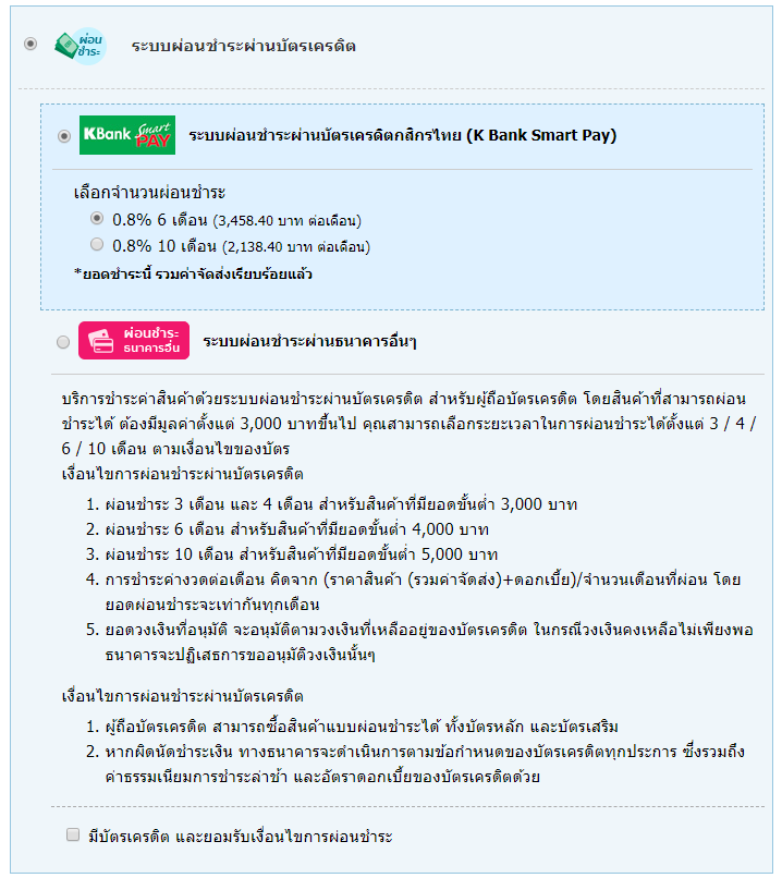 ระบบผ่อนชำระนี้ จะปรากฎให้เลือกชำระหากสินค้าชิ้นนั้นรองรับระบบผ่อนชำระ และมีมูลค่าตั้งแต่ 3,000 บาทขึ้นไป ซึ่งเพื่อนๆ สามารถเลือกระยะเวลาในการผ่อนชำระได้ตั้งแต่ 3 เดือน, 4 เดือน, 6 เดือน, และสูงสุด 10 เดือนตามเงื่อนไขของบัตรเครดิตนั้นๆ