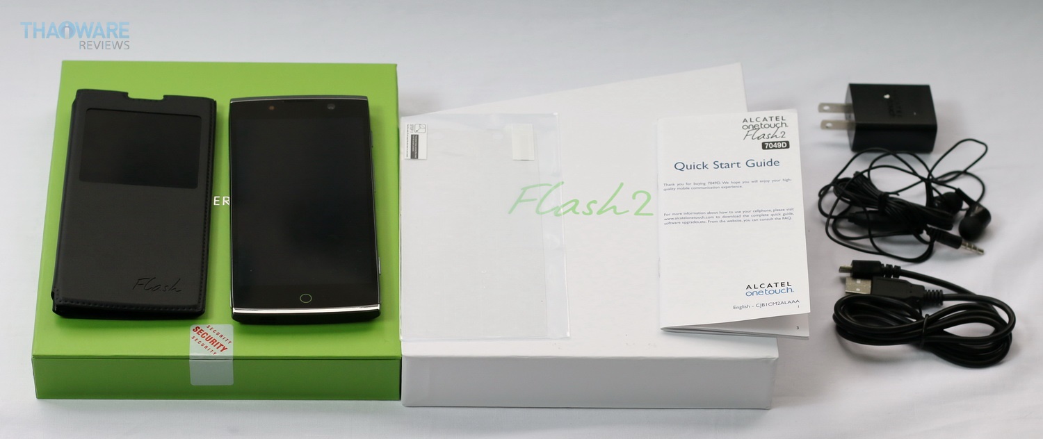 กล่อง Alcatel Onetouch Flash 2 ทำออกมาได้ดูดีเกินราคา มากทีเดียว อุปกรณ์ภายในกล่องจัดวางแบ่งช่องมาอย่างสวยงาม มีเคสและฟิลม์กันรอยให้มาในกล่องด้วย ไม่ต้องไปหาซื้อเองให้ลำบาก (ซึ่งน่าจะหายากด้วย)
