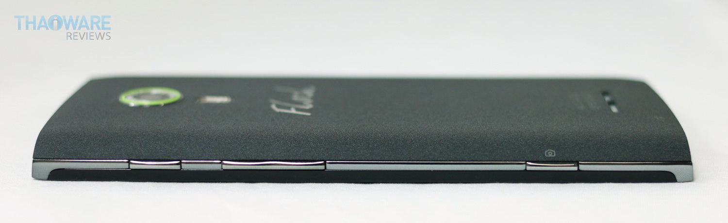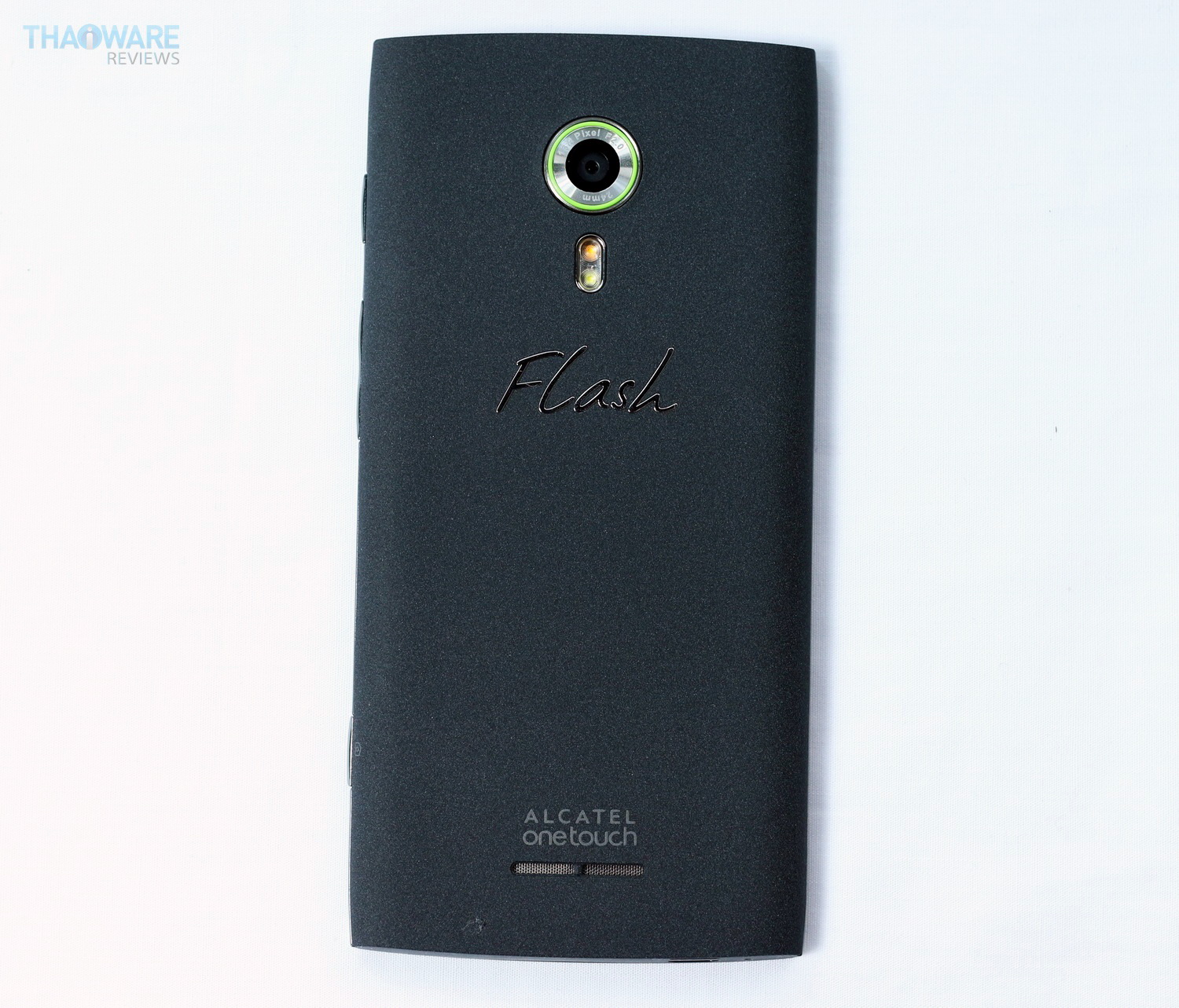 ด้านหลังเป็นพลาสติกก็จริง แต่พื้นผิวสากๆ คล้ายหินลับมีด แปลกดี แต่ก็สวยครับ ผมชอบมากกว่าเป็นพลาสติกเงาๆ นะ ติดรอยนิ้วมือยากดี กล้องจะยื่นออกมานิดหน่อยประมาณ 1 มม. ไฟแฟลชแบบทูโทน ให้แสงที่ธรรมชาติกว่าไฟขาวอย่างเดียว ด้านล่างมีรูลำโพงส่วนตัวผมไม่ค่อยชอบรุ่นที่ลำโพงอยู่ด้านหลังเท่าไหร่ เวลาวางหงายแล้วเสียงมันแบนๆ ชอบกล