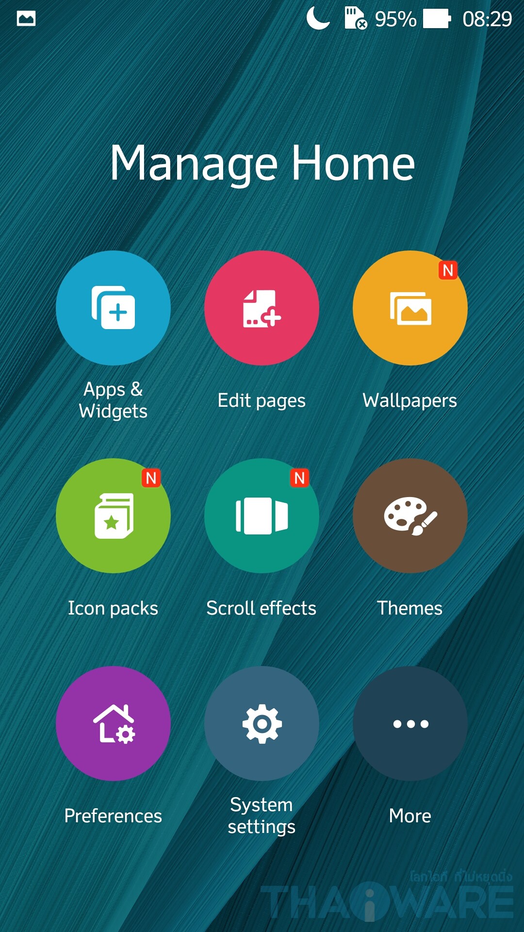 เมื่อกดปุ่ม Option ค้างไว้ จะปรากฎหน้า Manage Home ที่ออกแบบมาให้ดูง่าย และสามารถใช้ปรับแต่งตั้งค่าการใช้งานในส่วนต่างๆ ได้อย่างสะดวกไม่ว่าจะเป็น ธีม, ภาพพื้นหลัง, รูปแบบของวิดเจ็ต รวมถึงการตั้งค่าอื่นๆ ที่มาพร้อมกับระบบปฏิบัติการ Android เวอร์ชัน 5.0 Lollipop