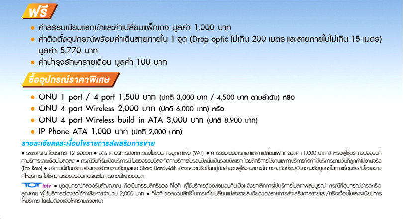 สำหรับผู้ที่สนใจติดตั้ง สามารถติดต่อที่ศูนย์บริการลูกค้า ทีโอที หรือดูรายละเอียดโปรโมชั่นได้ที่ www.tot.co.th หรือโทรสอบถามที่ TOT contact center โทร.1100