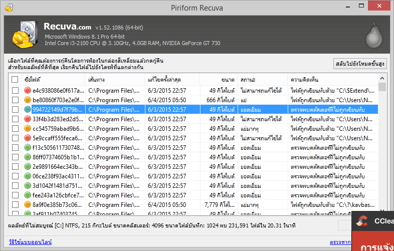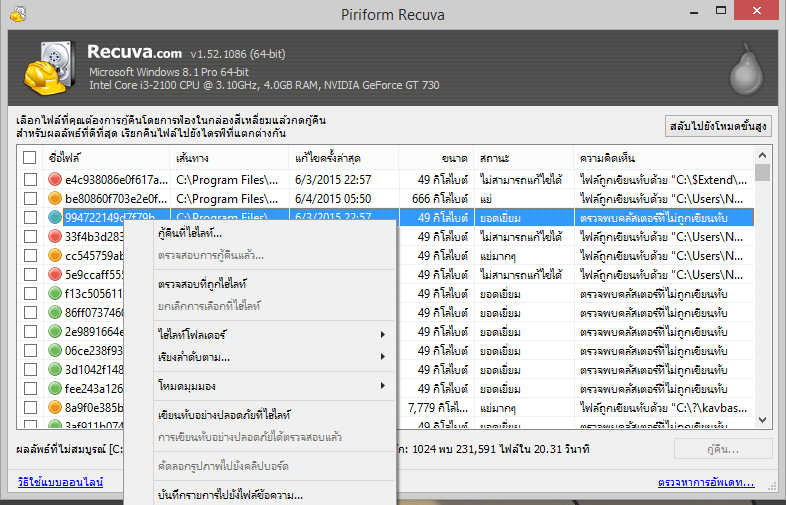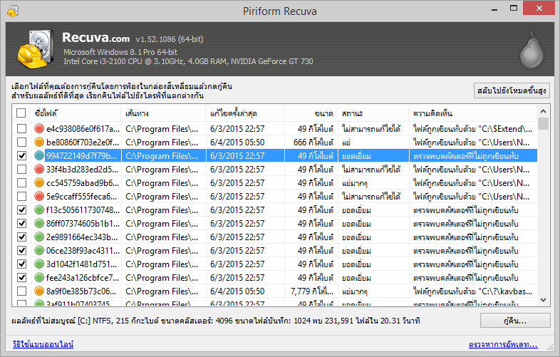 เอาล่ะ ! ทีนี้เราก็พบกับไฟล์ที่ทำการตรวจเจอได้นั่นเอง จะมีสถานะบอกว่าไฟล์เหล่านั้น สามารถกู้คืนได้หรือไม่ รายละเอียดก็จะมีดังนี้